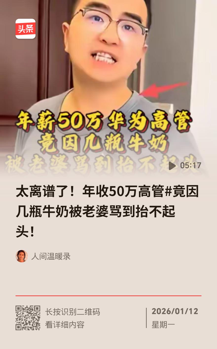年薪50万全上交还挨骂 只因拎回几瓶福利奶 真离谱!华为中层高管年薪50万,工资一分不落全上交,就因下班拎回几瓶公司福利牛奶,竟被妻子当众摔瓶怒骂,还拍视频要发网上评理。 事发傍晚,这位高管刚进门,就把靠业绩换来的限量牛奶摆上桌,想着给孩子当早餐。谁料妻子瞧见“福利”俩字当场变脸,嫌弃免费奶丢人,抓起牛奶就往沙发上摔,玻璃碰撞声吓得孩子缩起脖子。 高管急得掀开衣角,露出穿了许久的几十块旧保暖衣,辩解自己省吃俭用全为家里,可妻子根本不听,反倒指责孩子总生病就是喝了这种“没牌子”的奶。 网友深扒后才知道,这位高管在公司格外节俭,衬衫领口起球、手机屏幕开裂都舍不得换,对家人却大方得很——妻子用最新款苹果手机,护肤品包包买不停,家里每月开支四万多,大半都花在妻子身上。 此前他因想攒孩子择校费、提了句收回部分财政权,就被妻子断网、踢出家庭群,道歉后才平息。这次牛奶事件,不过是妻子又一次找茬。 视频曝光后,妻子账号被吐槽上万条,只能删视频收场。而这位高管念及孩子和往日情分,迟迟不愿放手。 说到底,婚姻的好坏从不是看年薪多少,互相尊重、体谅才是过日子的根本。单方面的付出与消耗,撑不起一个有温度的家。华为老总 华为技术总监 华为高管合照 华为老员工