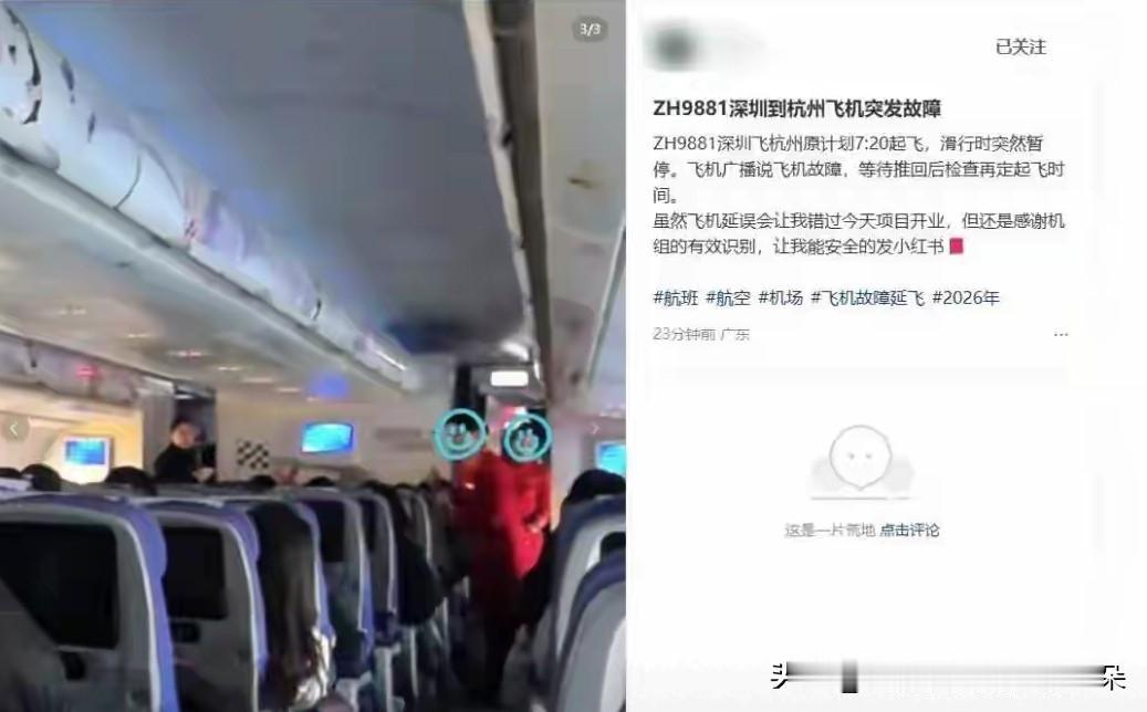 【突发!深航ZH9881航班滑行中紧急叫停,乘客亲述"惊魂一刻"】 1月12日早7时许,原本应载着百余名旅客飞往杭州的深航ZH9881航班,在深圳宝安机场跑道上经历了一场"计划外的等待"。据机上乘客向@深圳身边事 反映,该航班原定于7:20起飞,却在滑行至跑道准备加速时突然停滞,随后机舱内响起广播:"因需推回检查,具体起飞时间待定。" "当时我正系好安全带看窗外,突然感觉飞机停了,接着就听到'请保持原位'的提示音。"乘客王女士(化名)回忆,机舱内瞬间安静下来,部分旅客开始小声议论,"有人问空乘是不是出故障了,空乘只说'按程序处理',没多解释。" 另一位同机旅客李先生则注意到,飞机在滑行道停留约10分钟后,被牵引车缓慢推回停机位。"推回时能看到地勤人员围在飞机周围,好像在检查什么部位,但具体原因我们也不清楚。"他补充道,截至发稿前,深航官方尚未发布此次延误的具体说明,仅通过短信告知旅客"因公司原因导致延误",并安排后续改签或退票。 针对此次事件,记者联系深圳宝安机场客服,对方表示"已关注到该航班情况,具体延误原因需以航空公司通报为准"。而深航官方客服则回应称"正在核实中,会尽快向旅客说明情况"。 航空安全无小事 尽管最终未影响飞行安全,但不少旅客对"滑行中临时叫停"仍心有余悸。民航业内人士分析,此类情况可能由机械检查、空管指令或天气变化等因素引发,属正常安全操作流程,但建议航司加强信息同步,减少旅客焦虑。 目前,该航班已重新排班,部分旅客选择改乘其他航班,部分则继续等待。我们将持续关注事件进展,也提醒广大旅客:遇航班异常时,可通过航司APP、机场显示屏或现场工作人员获取最新信息,保持耐心。 (注:文中乘客均为化名,事件细节以官方通报为准。) 深航延误 深圳机场
