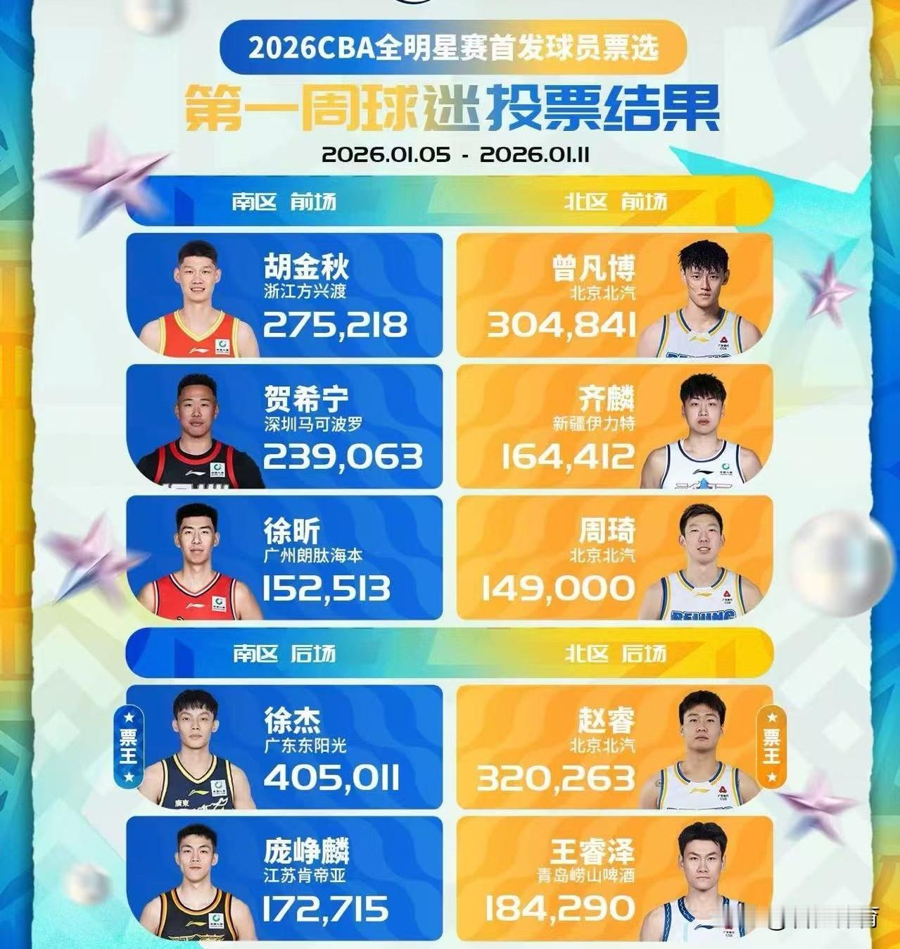 CBA官方公布第一周全明星首发票数,徐杰当选票王,胡明轩竟然进不了首发? 第一周票选结果,南北区5人如下: 南区:徐杰(票王)、庞峥麟、贺希宁、胡金秋、徐昕 北区:赵睿(北区票王)、王睿泽、曾凡博、齐麟、周琦 这个首发阵容,徐杰拿下票王,应该是在意料之中的了,毕竟他新赛季打的好,广东球迷又多,看好徐杰后面能保持优势,再次拿下全明星票王。 而另人意外的就是胡明轩了,胡明轩球迷、粉丝也不少,这次投票,竟然进不了前2,落后于一年级的庞峥麟,这究竟是广西球迷太给力了,还是广东球迷不给力? 又或者是胡明轩新赛季的表现,让太多广东球迷心寒了,所以没投他?