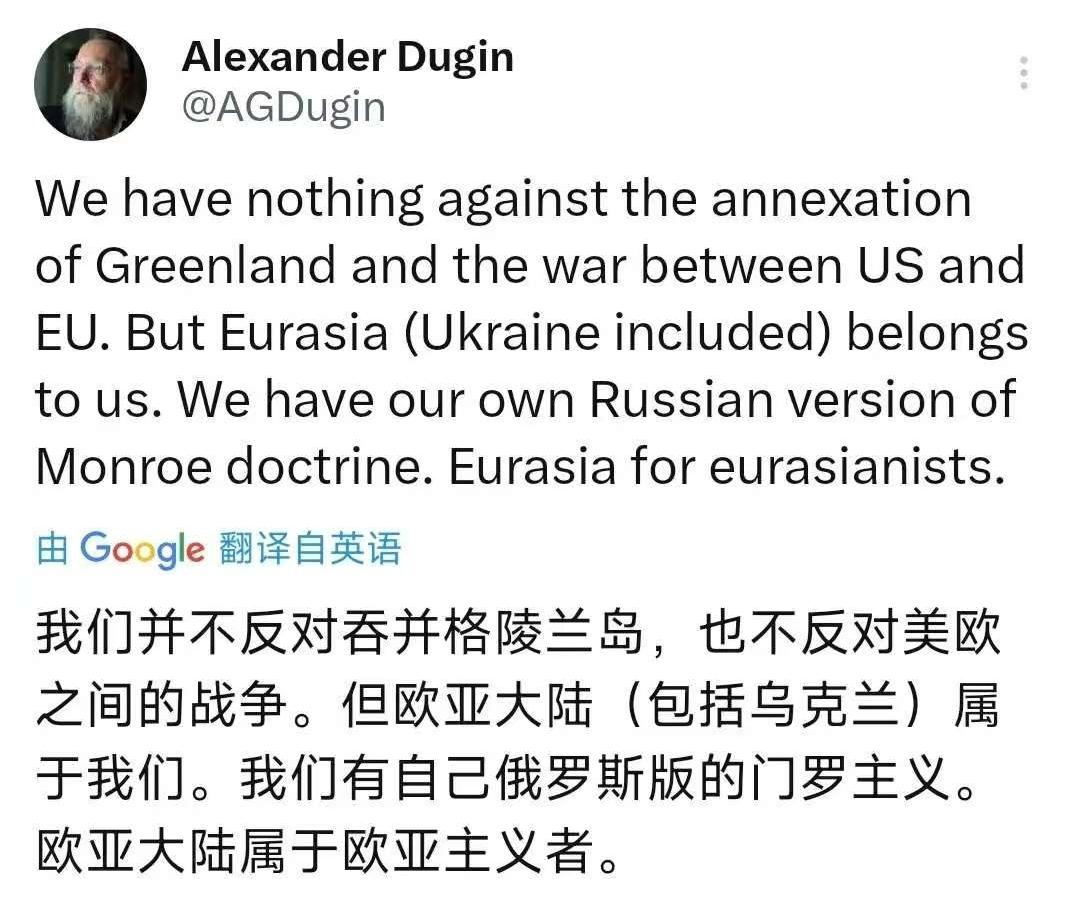 1月12日,普京国师、亚历山大·杜金发文写道:“我们并不反对美国吞并格陵兰岛,也不反对美欧之间的战争,但欧亚大陆(包括乌克兰)属于我们,我们也有自己俄罗斯版的门罗主义,欧亚大陆属于欧亚主义者。” [机智]国师的霸权呓语——偷换门罗主义,难逃帝国旧梦破产,杜金大言不惭喊出欧亚归俄,还扯出俄版门罗主义,堪称现代版帝国迷梦呓语!1823年美国门罗主义尚遮遮羞,他倒直白露骨,一边对美欧纷争隔岸观火,一边觊觎欧亚大陆,连乌克兰19.25%被占领土都嫌不够,2014年吞并克里米亚遭全球制裁,如今俄乌战场俄军年夺地仅4336平方公里,推进龟速却空谈霸权,何其讽刺!他无视欧亚数十国主权,把他国家园当自家后院,复刻沙俄扩张老路! 所谓欧亚主义者专属,不过是霸权遮羞布,门罗主义早成历史笑柄,杜金偏拾人牙慧包装侵略野心,殊不知时代变了,主权平等不是空话,俄军连乌克兰都啃不下,还妄想主宰欧亚,纯属自不量力的春秋大梦!