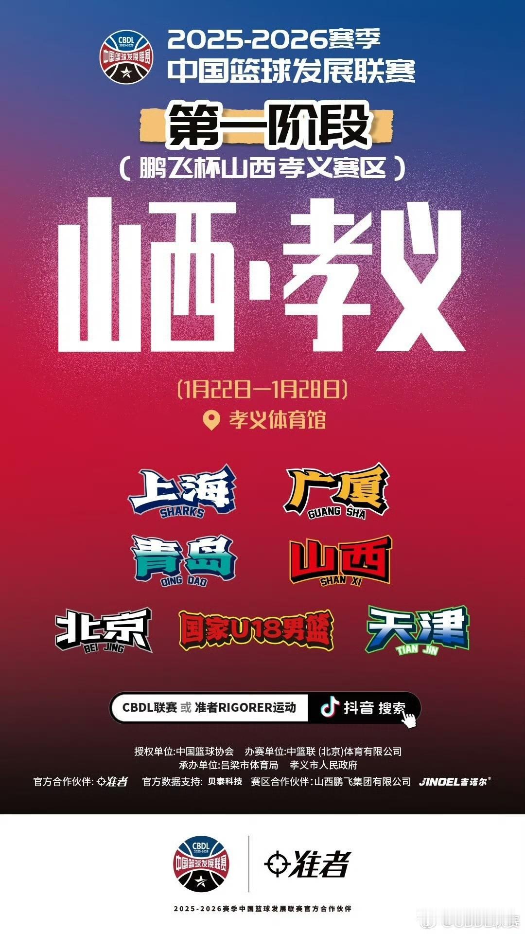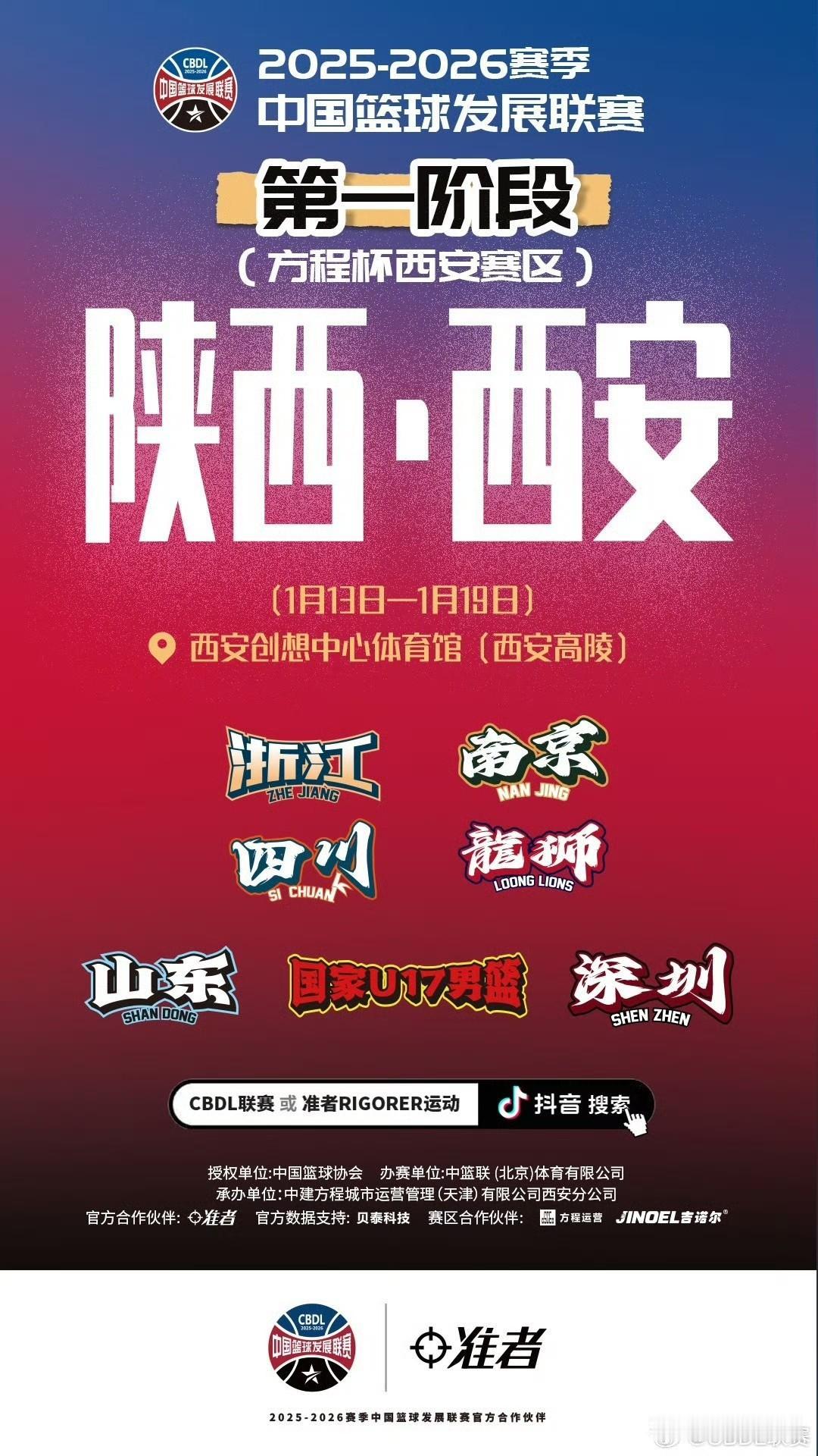 CBDL联赛第一阶段落户孝义和西安!附参赛名单! 2025-2026赛季中国篮球发展联赛第一阶段比赛将于1月13日和1月22日分别在陕西西安和山西孝义两大赛区举办。 🌟西安赛区: 时间:1月13-19日, 地点:陕西省西安市创想中心体育馆 参赛队:浙江、南京、四川、广州、山东、深圳、U17国家队 🌟孝义赛区 比赛时间:1月22-28日 地点:山西省吕梁市孝义市体育馆 参赛队:上海、广厦、山西、青岛、天津、北京、U18国家队