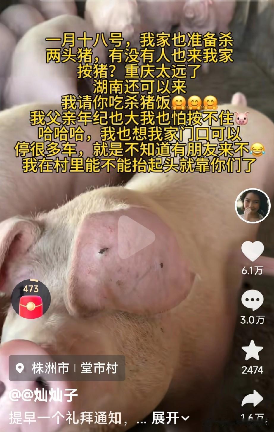 呆呆火了后,又刷到一个湖南叫灿灿的小姐姐说,她看到呆呆直播间这么火,很热闹,自己家也要杀两头猪,有湖南的朋友可以来帮忙按猪,她父亲也年纪大了。有来的朋友请他们吃杀猪宴。 没想到短短的几个视频,她的六个群都加满了,她说本来想杀两头猪的。现在和父亲商量了一下,也可以杀十头猪。这下,她的评论区也火了,不光湖南的,有好多外省人也想来她家 吃杀猪宴。小姐姐表示欢迎。 她说自己也去社区报备了。 呆呆是无意识的火了,又出了一个灿灿,我还刷到几个要杀猪的,杀羊的。我想说,本来感觉到挺好的一件事,希望别因为流量到最后变味。 对于这件事,你怎么看呢?