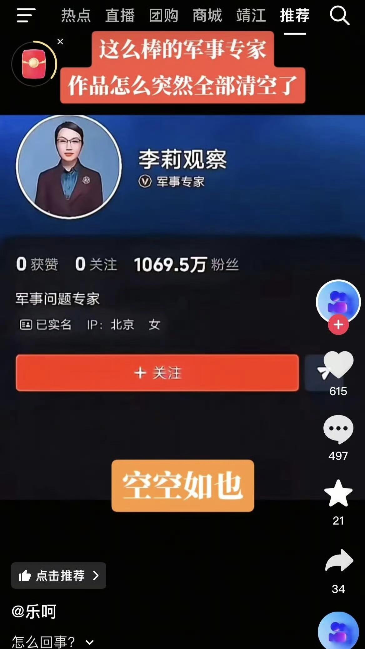 女军事专家李莉全部博文突然清空,你叫你那1069.5万粉丝看什么?要转行吗?