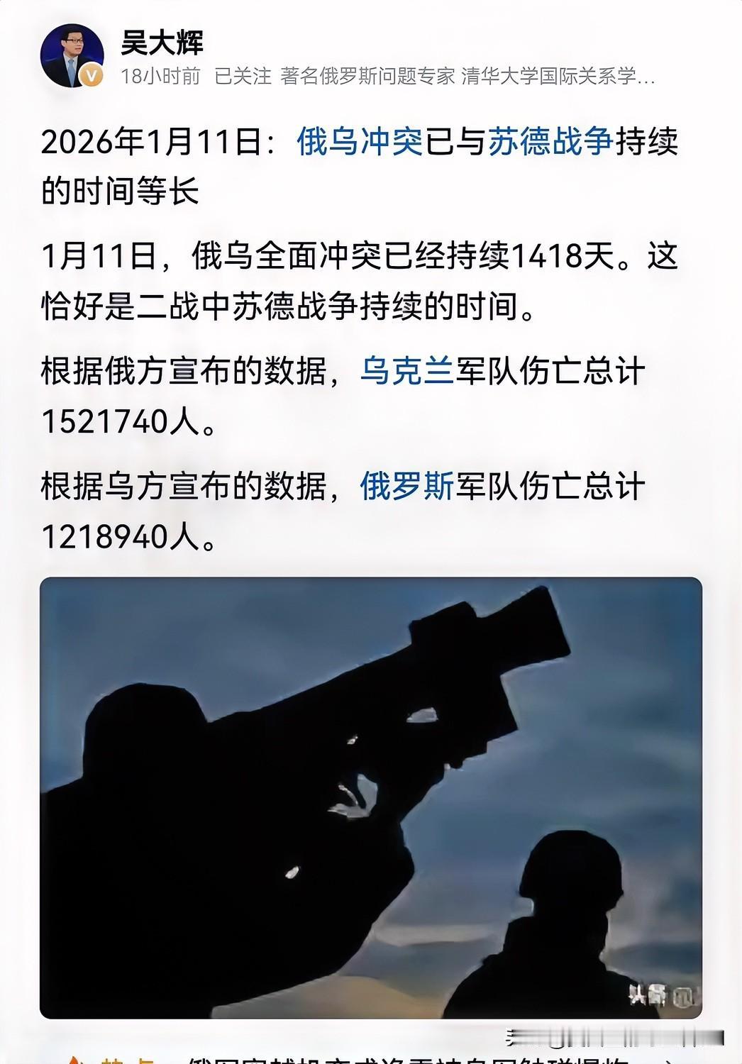 时间过的真快啊! 俄乌战争已经打了快四年时间, 从双方军队,伤亡的士兵人数看,没有一个真正赢家。 双方共计伤亡人数,274万人,着实有些惊人,这个冰冷的数字后面,有多少家庭分崩离析。 当时开打时,以为乌撑不过三个月,大熊会速战速决,没想到弄成了旷日持久战! 实际可以看出,熊没那么强,乌没那么弱。 26年希望早日结束,这场无休止的纷争,还百姓一个安宁。