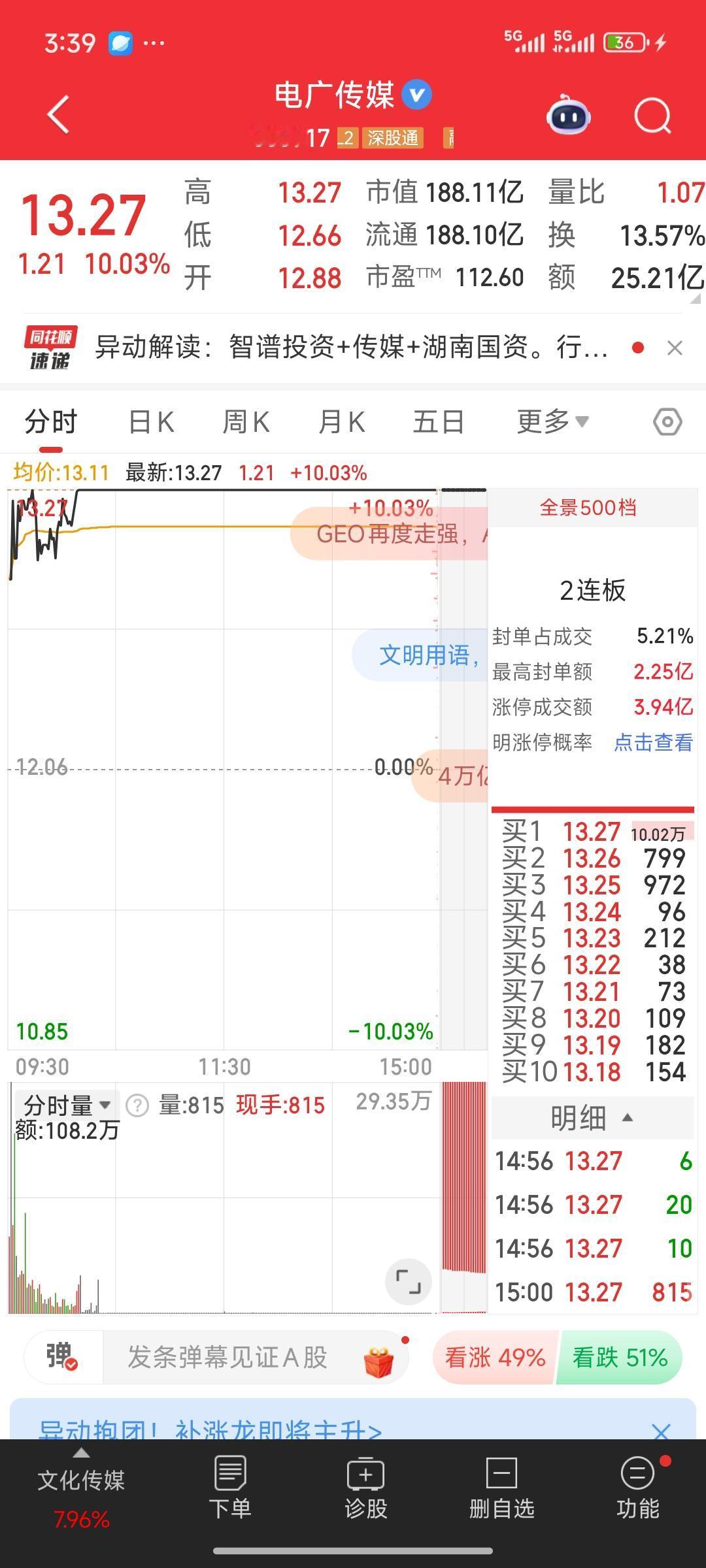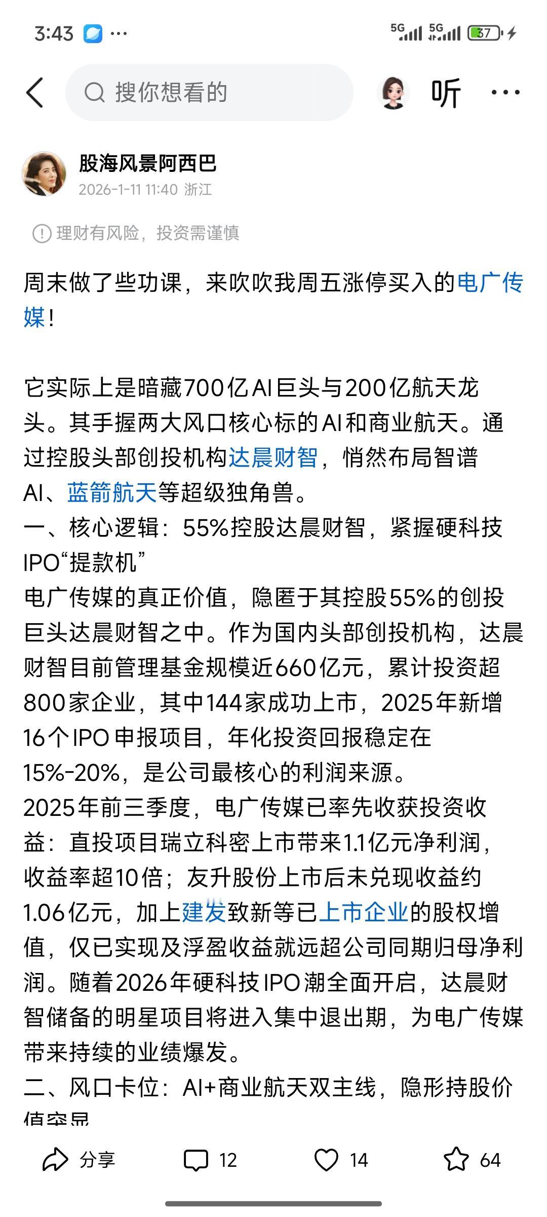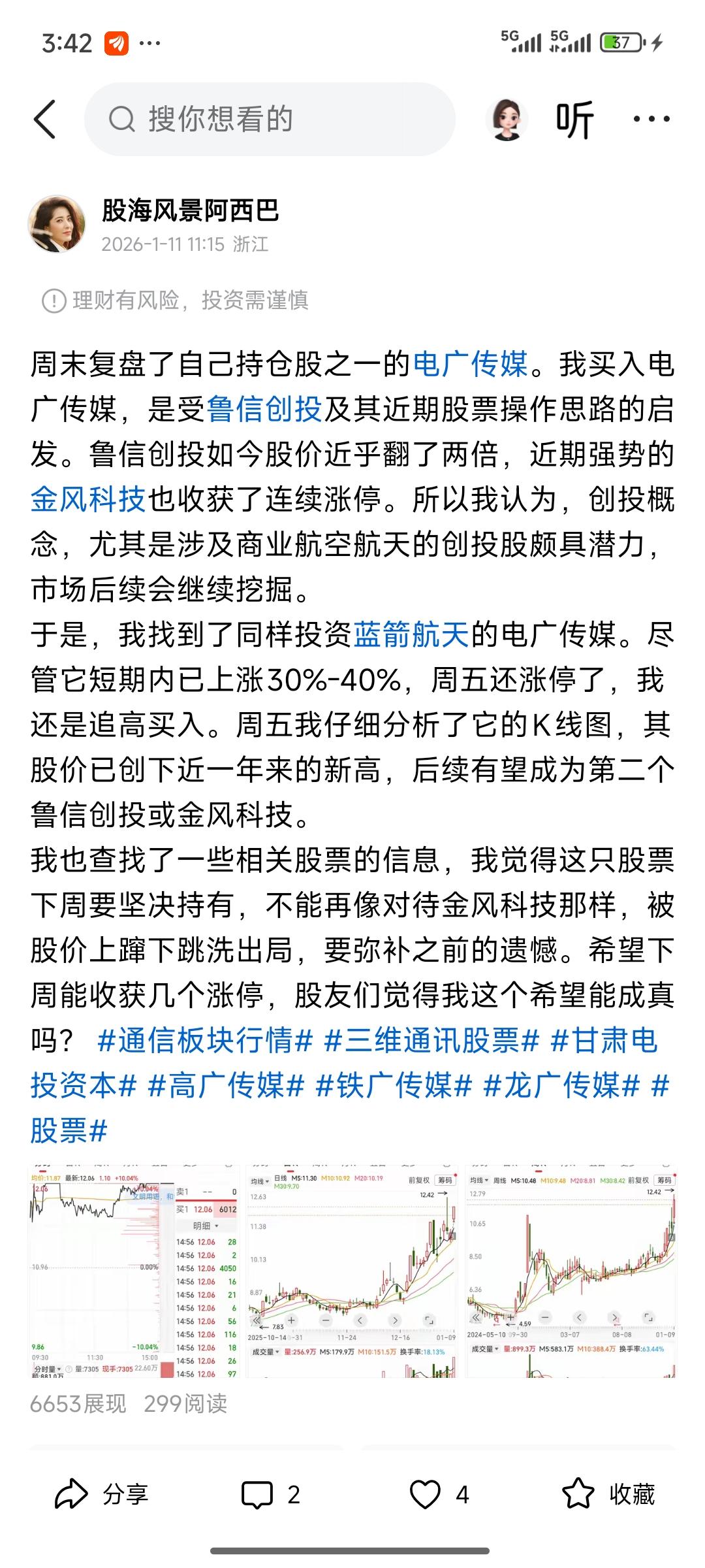 收盘了,我对持有的电广传媒进行复盘。如预期一般,它大幅高开,开盘前半小时成交量显著放大,充分换手后,稳稳封住涨停板。我认为它后续仍有上升潜力。目前,电广传媒集多重概念于一身,涵盖创投、商业航天以及AI概念。继续持有它没问题。各位股友,跟上节奏了吗? 传媒股票 龙广传媒 高广传媒 电线传媒 增广科技 铁广传媒 安广电子