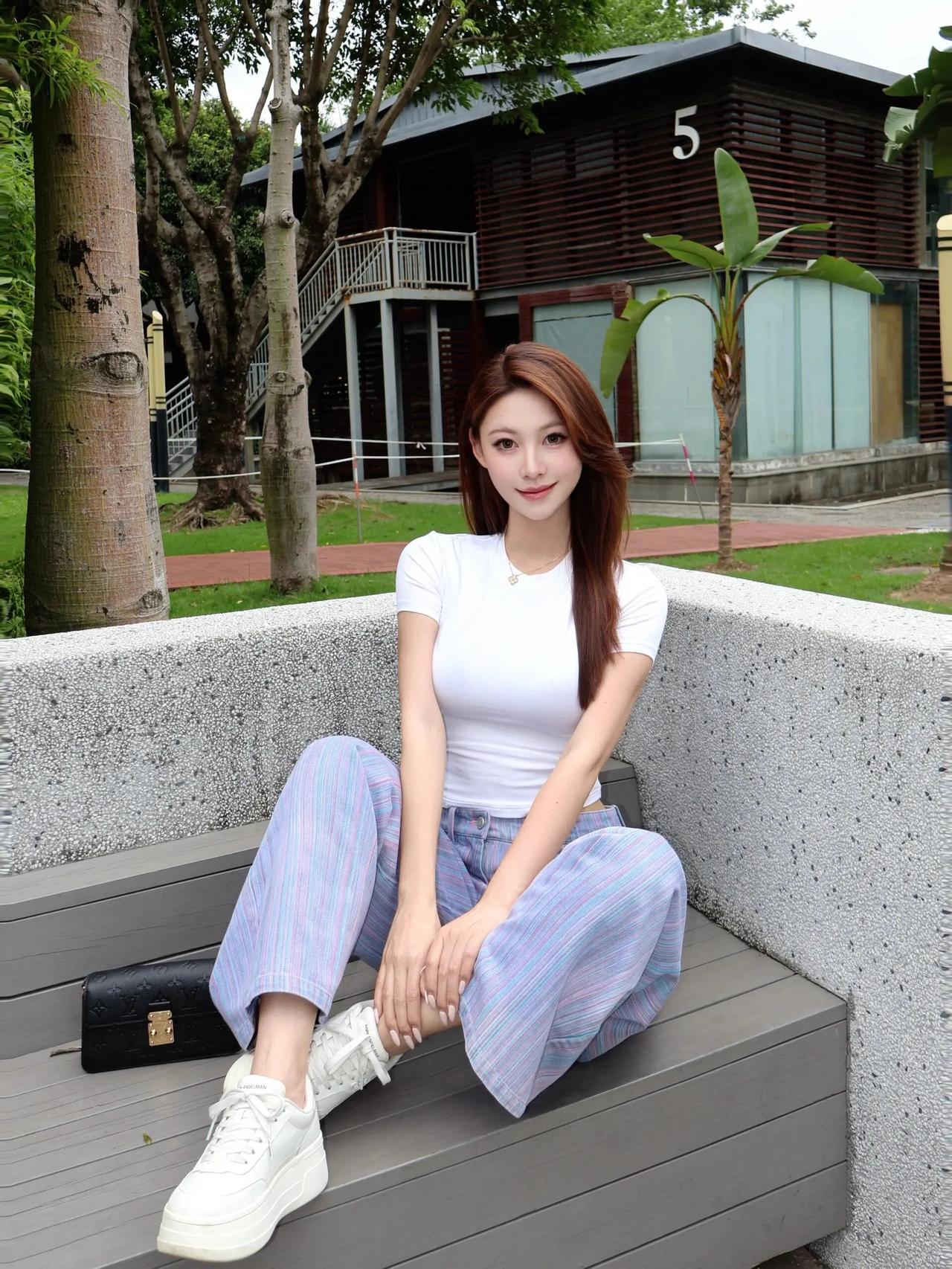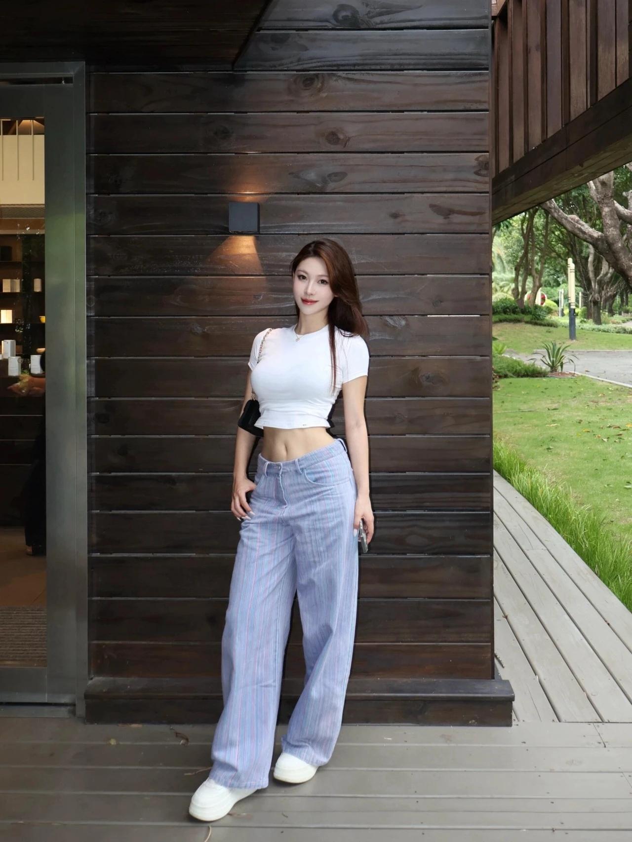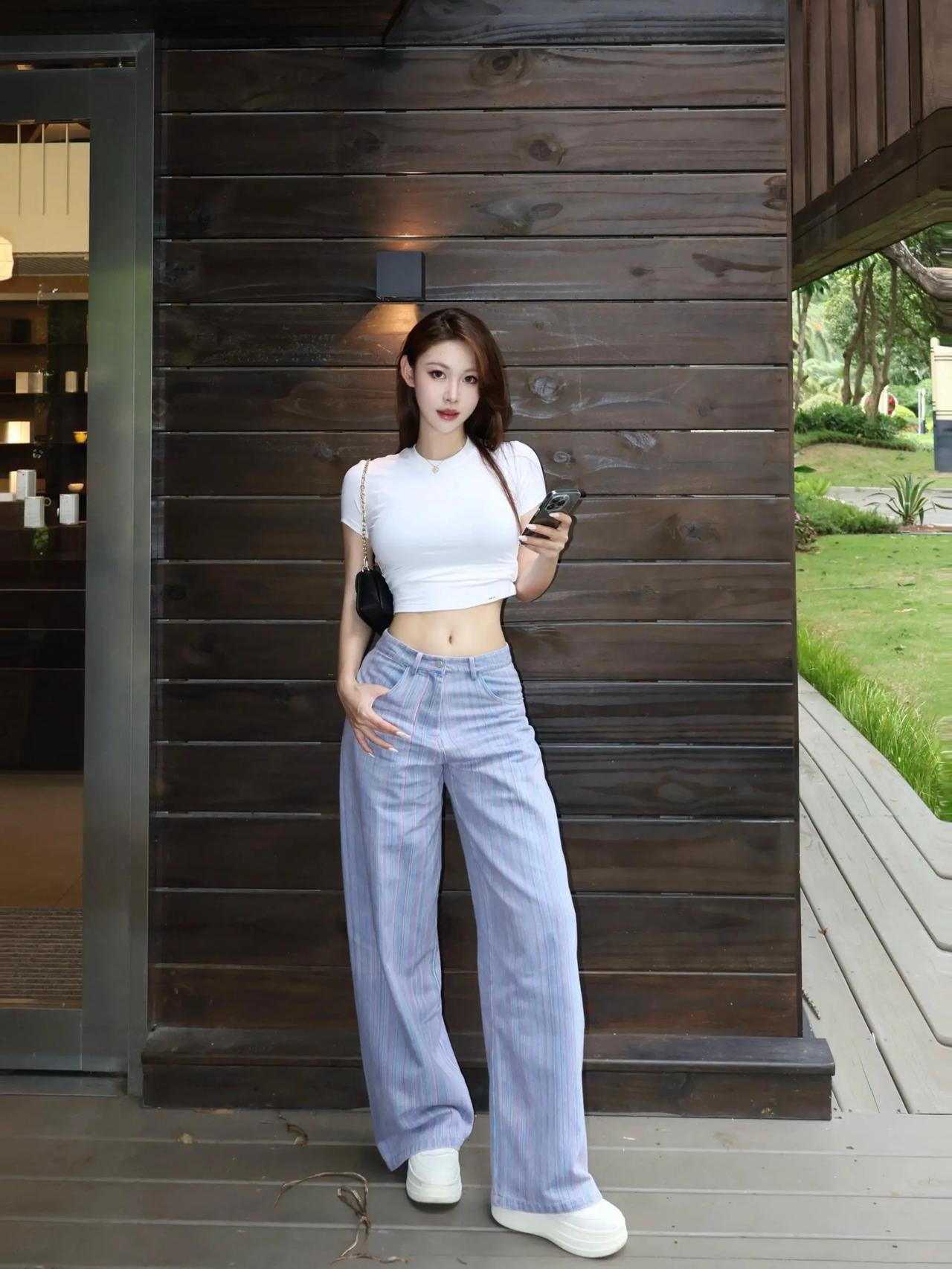 简约白T恤搭配宽松条纹裤,轻松打造休闲时尚感!