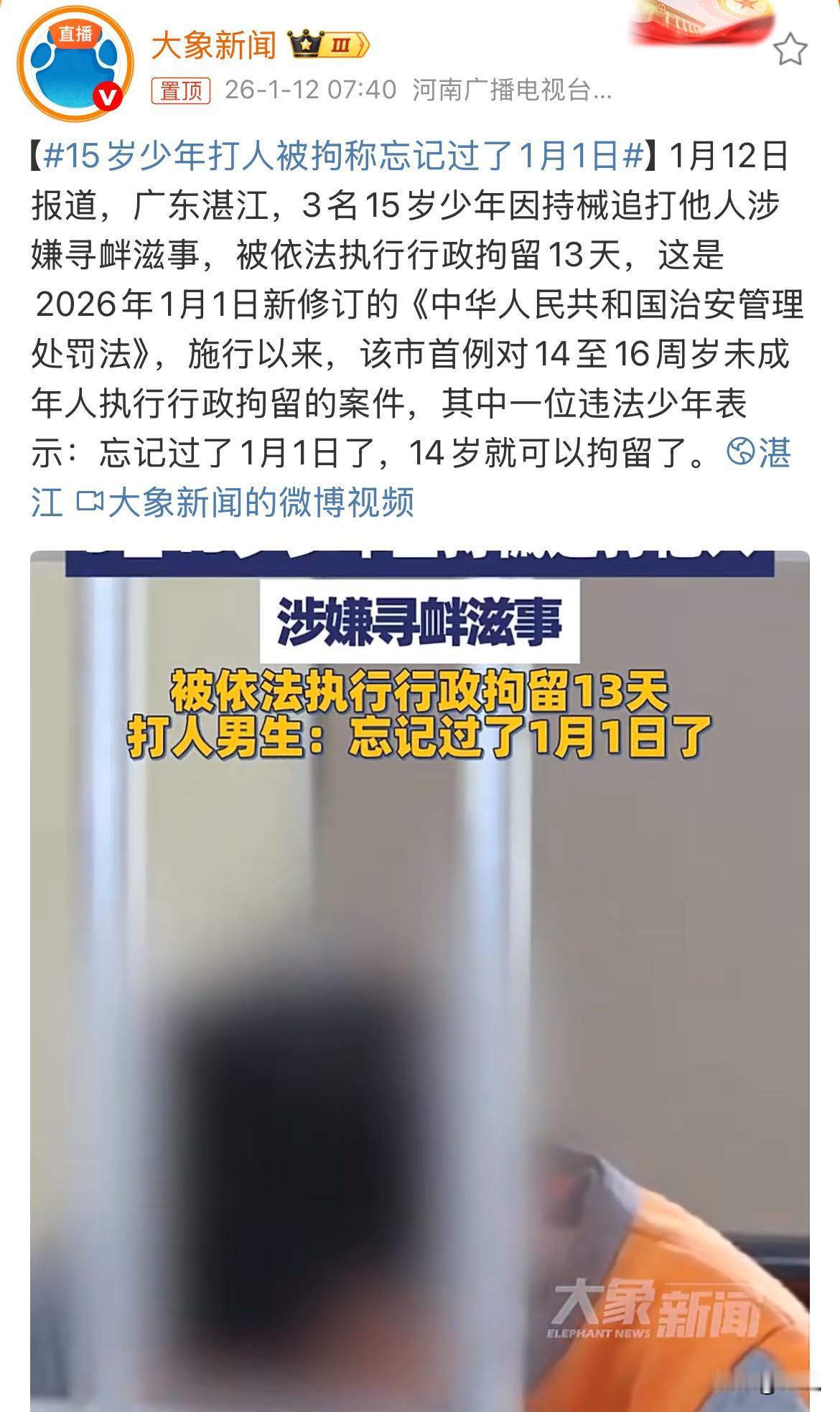 凌晨三点,湛江的街道已经没什么人了。三个十五岁的少年,手里拿着东西,在街上追打一个人。被打的人后来验出是轻微伤,但那个晚上的阵仗,吓坏了不少附近的居民。 事情过去不到一天,三个人就被警察找到了。他们坐在派出所里,脸上还带着些这个年纪特有的不在乎。直到警察告诉他们,每人要拘留十三天。其中一个叫彭某的男孩,愣了一会儿,突然冒出一句话:“我忘记过了1月1日了,14岁就可以拘留了。” 这句话,像一颗石子扔进水里,让整个事情泛起了不一样的波纹。 他说的1月1日,是个关键的日子。就在几天前,2026年1月1日,新的《治安管理处罚法》开始实行。旧规矩里,对14到16岁的孩子,犯了事大多以教育为主,很少真的拘留。可新规矩明明白白写着:只要情节严重,比如像他们这样持械、追打,就算不满16岁,该拘留一样拘留。 他们撞上了。成了新法施行后,湛江第一批因为这样的事被拘留的少年。 你仔细品品彭某这句话。他觉得问题出在“忘记”了日期。好像记住法律哪天生效,比记住不能打人更重要。在他心里,那条约束自己的线,不是“对与错”,而是“罚与不罚”。这是一种让人后背发凉的计算。他把法律当成了游戏规则,以为只要卡在规则变动前,就还能像以前一样“安全”。 这种想法不是凭空来的。过去有些案例,确实让一些孩子产生了错觉。他们觉得“未成年”三个字是块铁打的盾牌。有的孩子甚至会在派出所里说:“我知道,我不到年龄,你们不能拿我怎么样。” 这种有恃无恐,比一时的冲动更可怕。 所以,这次拘留,远远不止是惩罚三个犯错的少年。它是一声响亮的警钟。它用最直接的方式告诉所有人:法律在更新,在变严。那道曾经模糊的年龄防线,现在被清晰地标红了,而且通了电。它保护的是孩子的未来,但绝不纵容今天的错误。 这件事的焦点,从来不是那三个少年,甚至不是那句有点荒唐的“忘记了”。焦点是,我们如何让一个孩子在成长过程中,先把“是非对错”装进心里,而不是先去计算“风险代价”。法律的完善是坚固的后盾,但真正的防线,应该筑在每一个孩子的心里。 从记住一个日期,到懂得敬畏规则,这条路还很长。但愿这十三天的拘留,能成为一个让更多人清醒过来的开始。