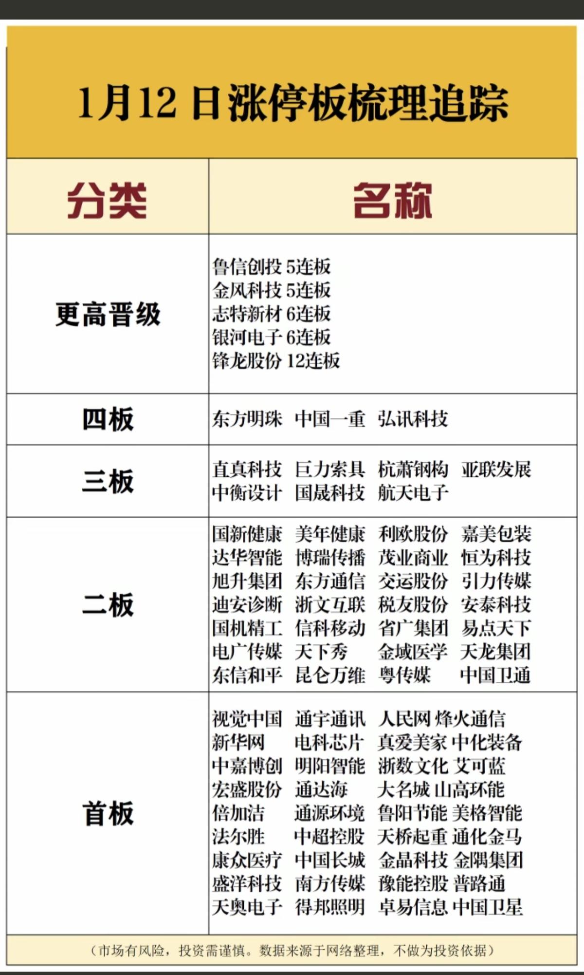 1.12周一 涨停板股票:复盘总结! 12连板 锋龙股份 6连板 志特新材 银河电子 5连板 鲁信创投 金风科技 4连板 东方明珠 中国一重 弘讯科技