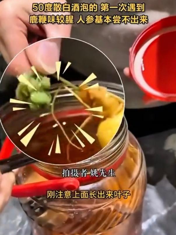 上海的王先生喜欢喝药酒,三年前用东北朋友送给他的新鲜人参泡了酒,最近打开一看,人参竟然在酒里发芽了,还长出了绿叶,把在场的人都看傻了。 王先生今年五十多岁,喜欢喝药酒已经有好多年了。2023年初,东北的老朋友给他寄来一根新鲜人参,说是正宗的长白山的人参,让他好好补一补身体。 他宝贝得很,特意买来50度的纯粮白酒,又放上鹿鞭一起泡着,封好口后小心地放进储物柜最里面,想放上几年再喝,效果会更好一些。 放了三年,期间他偶尔想起,但觉得还没有到时机,所以一直没有行动。直到前几天家里来的朋友,他才记起这个藏在箱底的好东西,打算拿出去炫耀一下。 结果酒坛子一打开,大家全都呆住了。泡了三年的人参竟然长出了嫩绿的叶子,在酒中静静漂浮着,仿佛活了一样。 朋友们围了上来,有人说道活久见,有人则说这是不是成精了,王先生自己也是懵的,泡在酒里三年,怎么会发芽呢? 这件事很快被传到了网上,山东农业大学的一位植物学教授看到了之后给出了自己的解释。他说这种情况发生的几率很低,需要同时满足以下三个条件:人参要新鲜,潜伏芽没有受到伤害;酒瓶要有微小的裂痕,形成特殊的微环境;储存的地方要保持恒温、避光。 三个条件同时满足,本身就是小概率事件,而王先生正好遇到了。 网友们看完后纷纷感叹,有人认为人参求生欲望也太强了吧,也有人认为这就是真正的生命奇迹。把种子泡在五十度的白酒中三年还能发芽,看到的人都会发愣。 生命有时候就是如此出人意料,你认为它早就沉寂了,其实它一直在默默地积蓄力量,等到合适的时候就会冒出来告诉你,它并没有消失。