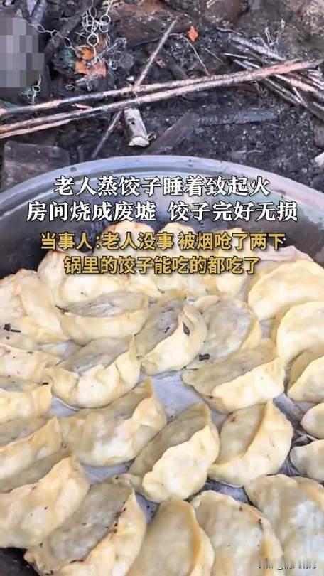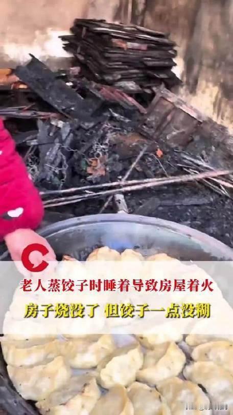 真是奇迹,大火烧了房子烧不了饺子! 1月10日,江苏徐州一位老人给钓友蒸饺子时