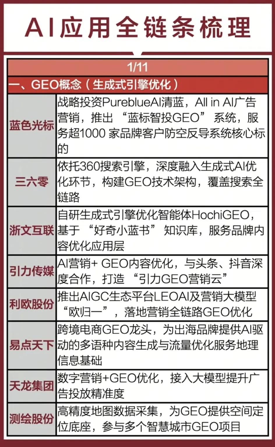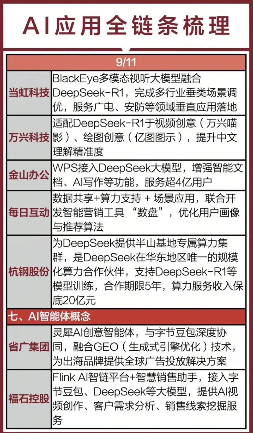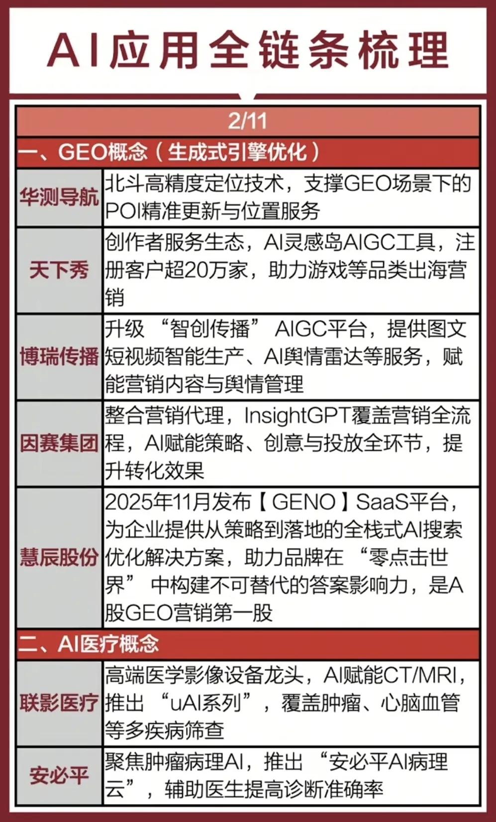 见证历史!沪指17连阳、成交额爆了!两市成交突破3.6万亿,直接刷新2024年10月8日创下的34549.33亿元纪录,AI应用领涨全场满屏幕涨停,资金情绪彻底爆发,赚钱效应拉满!相关概念龙头代表有哪些? AI题材概念最新人气龙头代表:易点天下、中文在线、天龙集团,江湖人称新“易中天”! AI应用全链条梳理来了!从GEO生成式引擎优化、AI医疗,到智谱AI、MiniMax、DeepSeek等大模型生态,再到AI智能体的多元落地,这份梳理覆盖蓝色光标、三六零、药石科技、中科曙光等众多企业的AI布局,清晰展现各赛道玩家的技术突破与场景应用,堪称AI产业布局的实用参考图谱~ 理财有风险入市需谨慎!