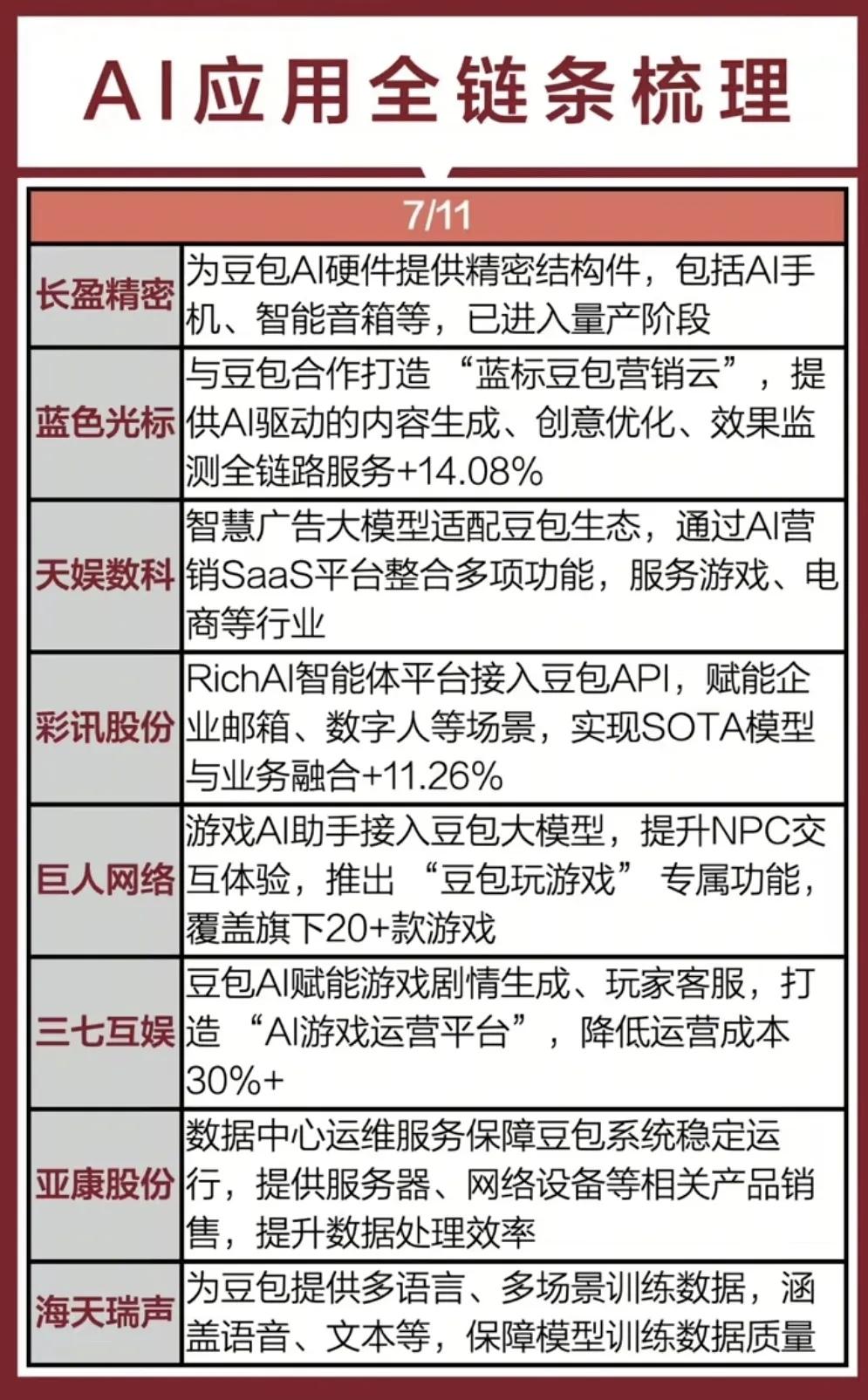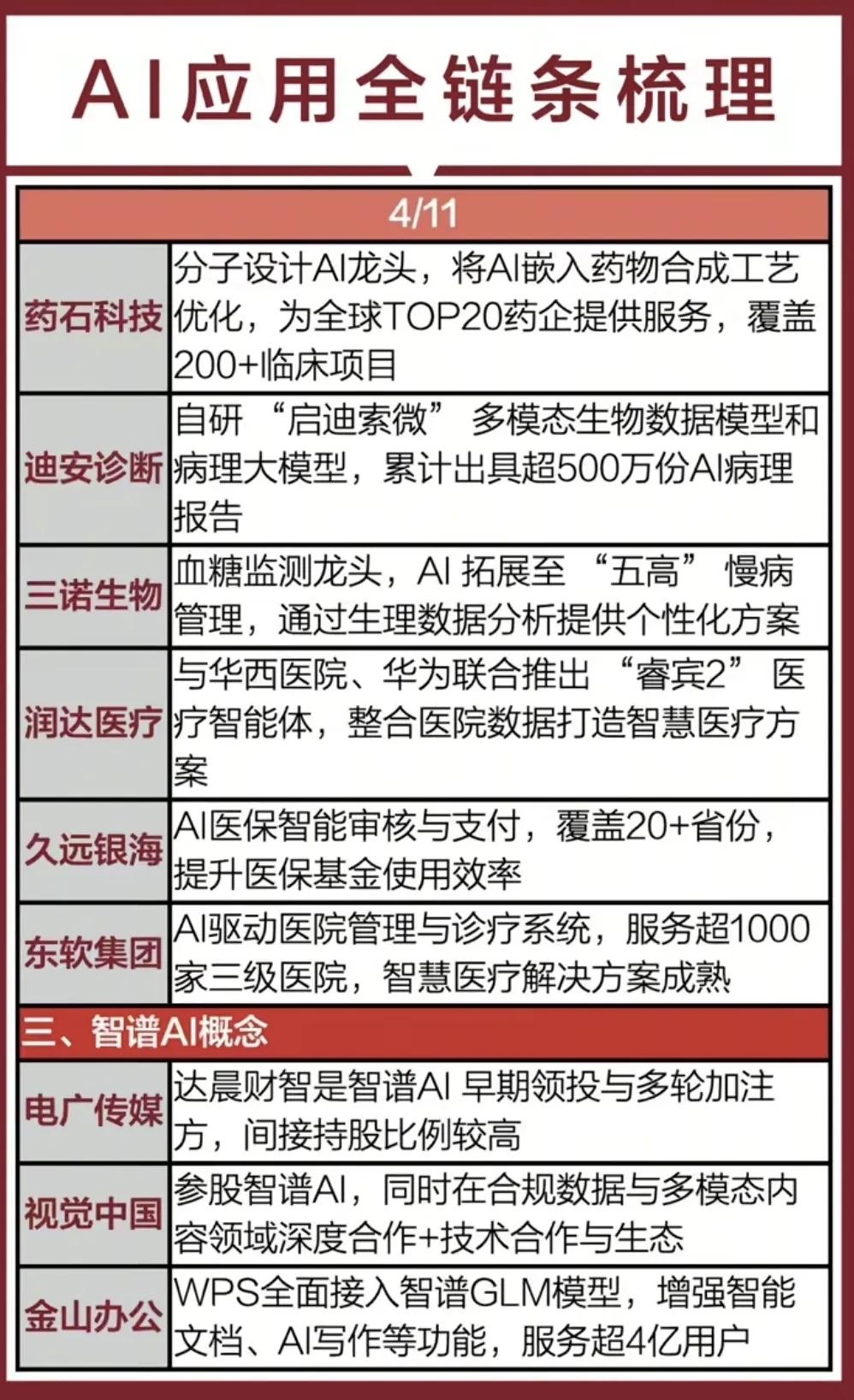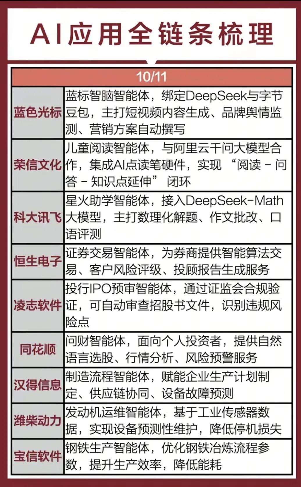见证历史!沪指17连阳、成交额爆了!两市成交突破3.6万亿,直接刷新2024年10月8日创下的34549.33亿元纪录,AI应用领涨全场满屏幕涨停,资金情绪彻底爆发,赚钱效应拉满!相关概念龙头代表有哪些? AI题材概念最新人气龙头代表:易点天下、中文在线、天龙集团,江湖人称新“易中天”! AI应用全链条梳理来了!从GEO生成式引擎优化、AI医疗,到智谱AI、MiniMax、DeepSeek等大模型生态,再到AI智能体的多元落地,这份梳理覆盖蓝色光标、三六零、药石科技、中科曙光等众多企业的AI布局,清晰展现各赛道玩家的技术突破与场景应用,堪称AI产业布局的实用参考图谱~ 理财有风险入市需谨慎!