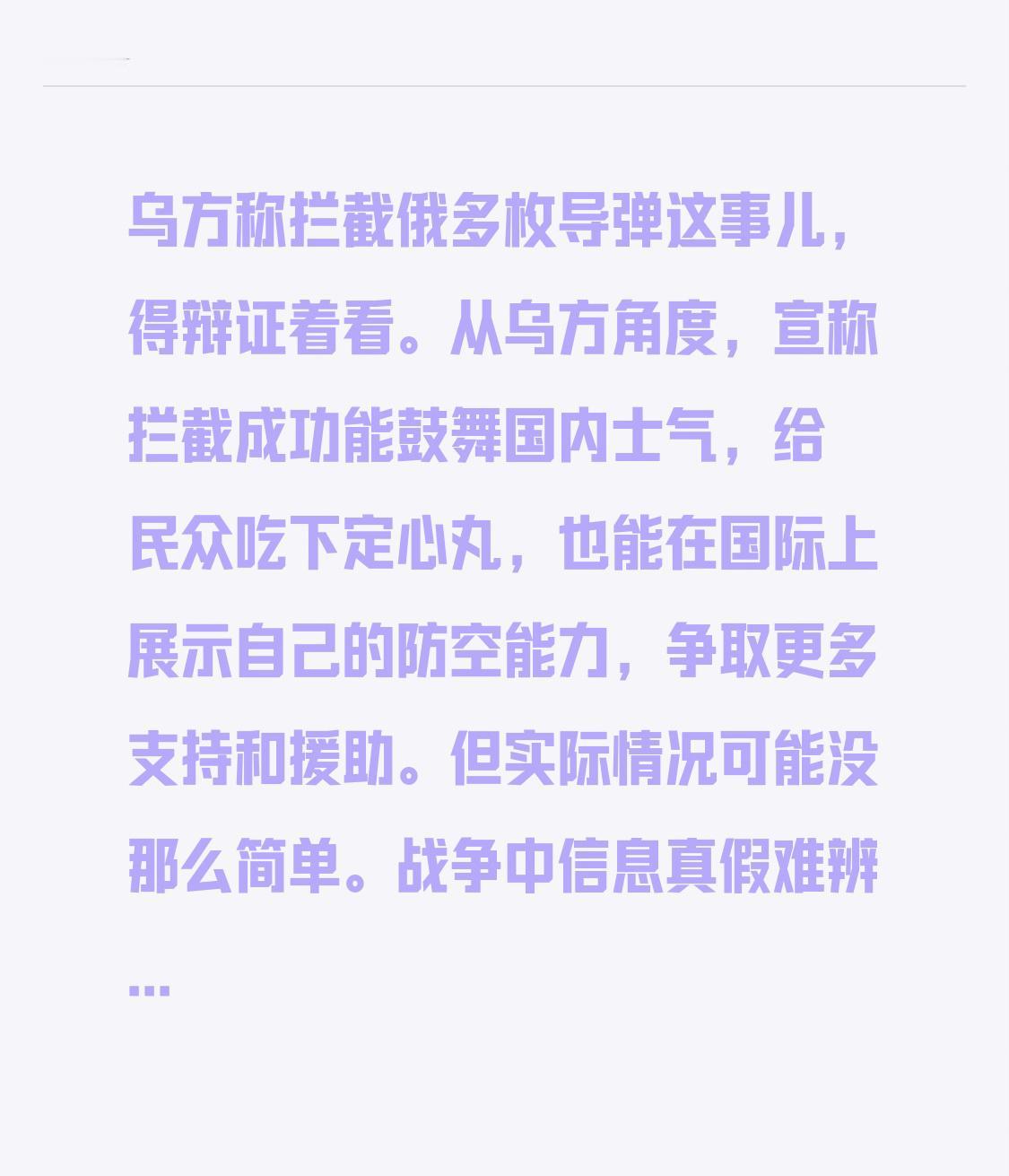 乌方称拦截俄多枚导弹这事儿,得辩证着看。从乌方角度,宣称拦截成功能鼓舞国内士气,给民众吃下定心丸,也能在国际上展示自己的防空能力,争取更多支持和援助。 但实际情况可能没那么简单。战争中信息真假难辨,乌方可能存在夸大战果的情况,为的是营造有利舆论。而俄罗斯方面,也不会轻易让乌方得逞,或许会调整战术。总之,在没有确凿证据前,对于乌方的说法,还是持保留态度,毕竟战争里的“嘴炮”也不少。