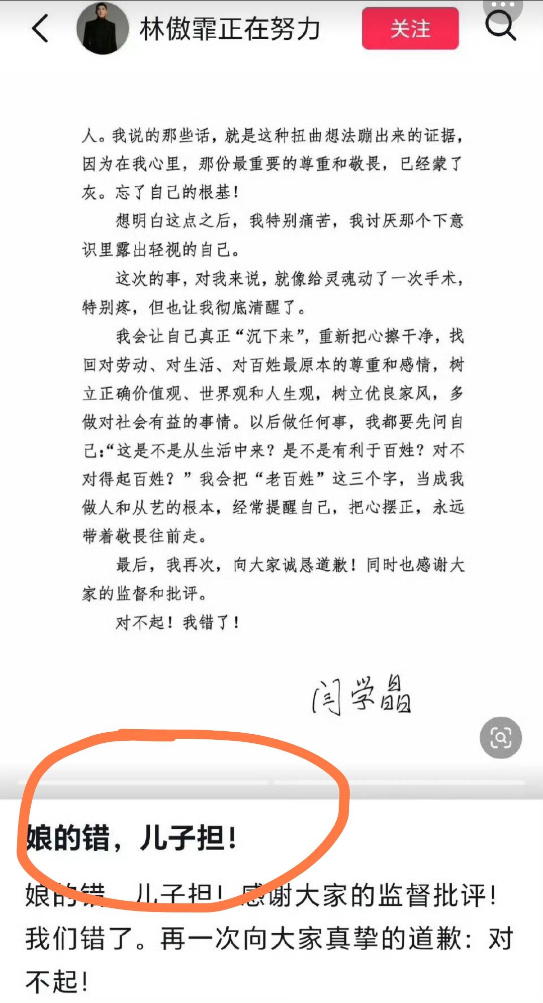 闫学晶儿子林傲霏这次发文道歉,真的特别有诚意,大家真的可以试着原谅他! 1月12日,林傲霏直接在个人账号上表态“娘的错儿子担”,直言要替母亲承担责任,还特意感谢了大家的批评和监督。 这份挺身而出的勇气,真的挺爷们的。 之前闫学晶因为几句无心之言惹了争议,当妈的正愧疚呢,儿子立马站出来扛事,这不是护母心切是什么? 而且中戏深夜特意发文,帮林傲霏辟谣了新疆班的相关传闻,证明那些乱七八糟的说法根本不属实,人家本来就是堂堂正正的,没走任何特殊渠道。