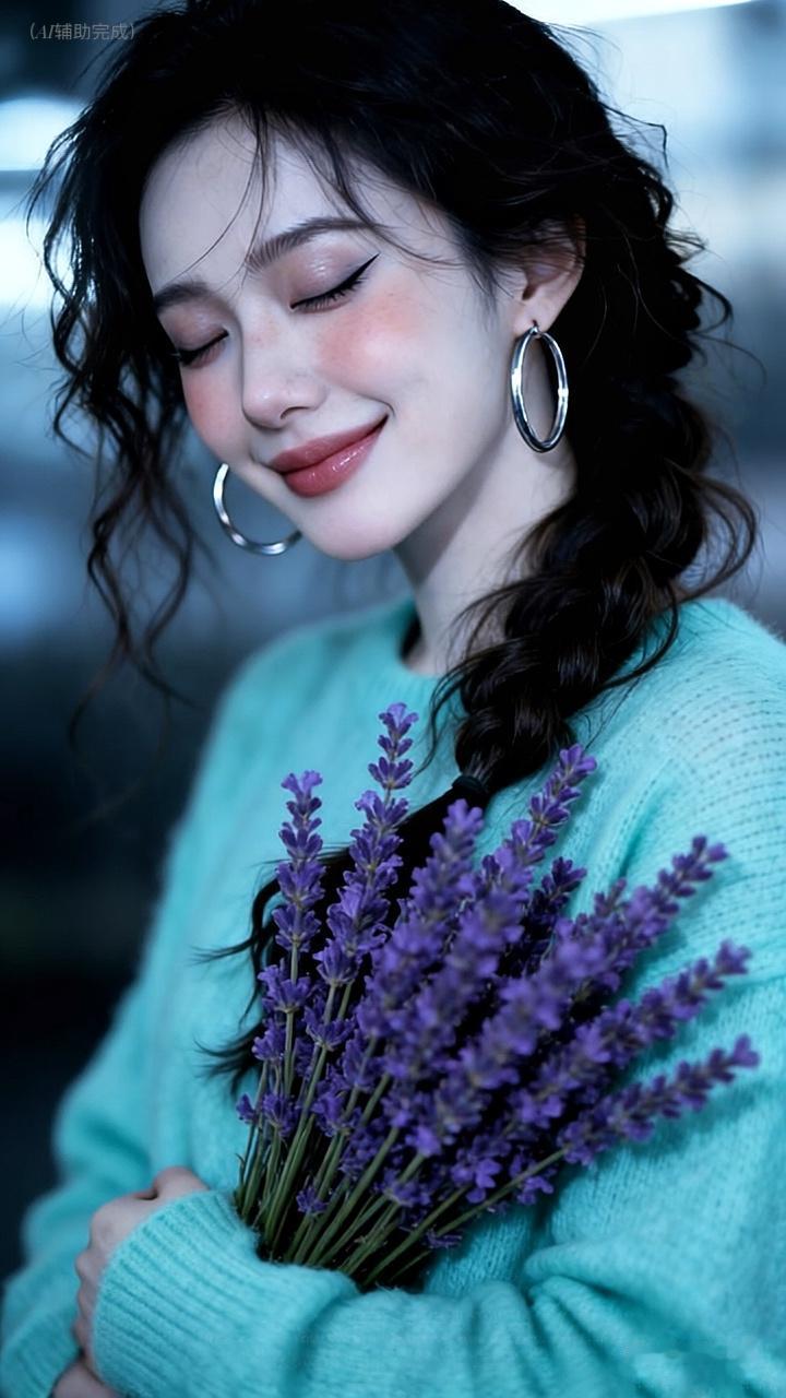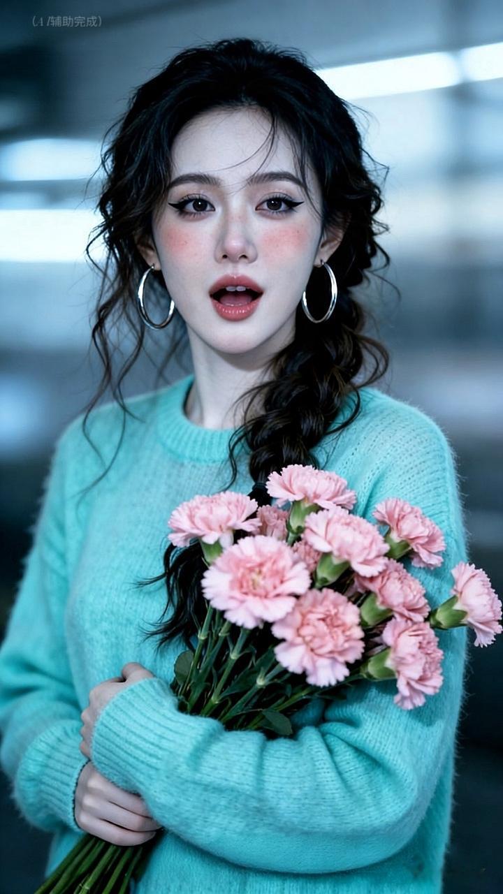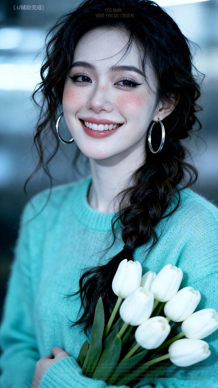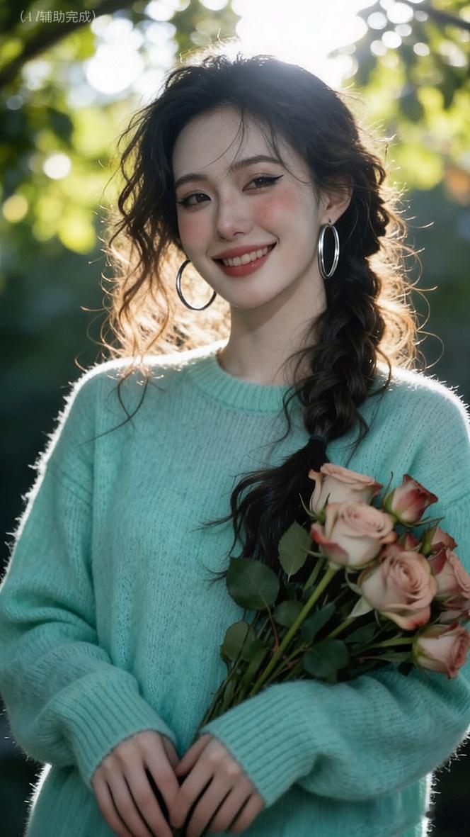 薄荷绿毛衣裹温婉,乌黑辫垂肩泛柔光。银环耳坠添时尚,手捧玫瑰笑靥甜。眉眼弯弯眸藏