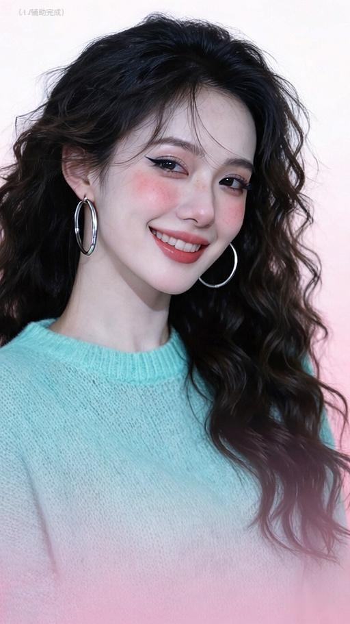 乌黑卷发如绸缎垂落,发丝光泽亮丽,白毛衣裹着温柔。她眉形精致,眉眼含情眸亮如星,