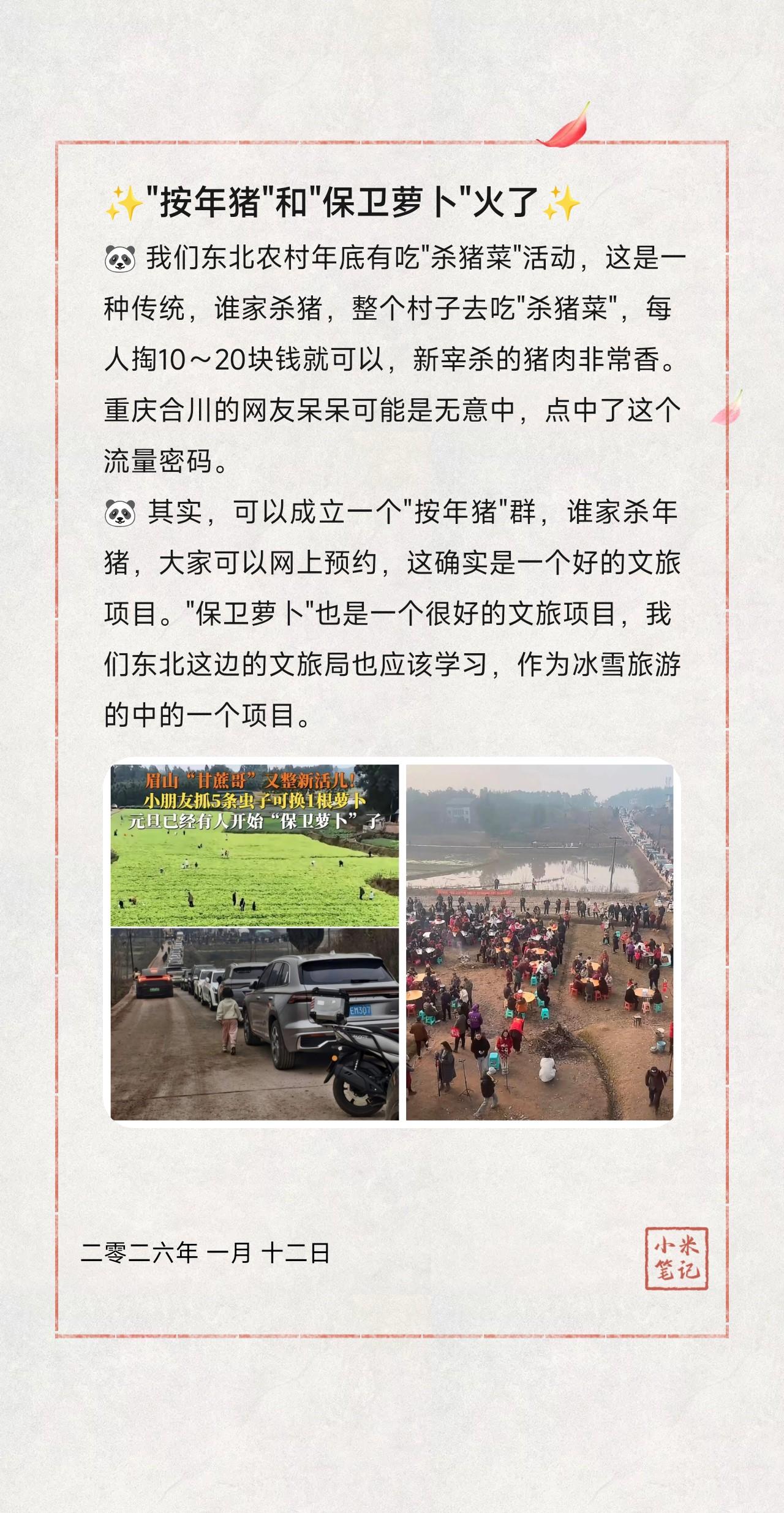 🐼 我们东北农村年底有吃"杀猪菜"活动,这是一种传统,谁家杀猪,整个村子去吃"杀猪菜",每人掏10~20块钱就可以,新宰杀的猪肉非常香。重庆合川的网友呆呆可能是无意中,点中了这个流量密码。 🐼 其实,可以成立一个"按年猪"群,谁家杀年猪,大家可以网上预约,这确实是一个好的文旅项目。"保卫萝卜"也是一个很好的文旅项目,我们东北这边的文旅局也应该学习,作为冰雪旅游的中的一个项目。 🐼 贫道个人认为,AI时代人们的生活方式要发生重要转变了,机器人取代了人类的大部分工作,而人类则要自发的组织出各种各样的游戏和娱乐活动。所以说,AI时代,创意和创新都是非常重要的能力。 作者:龙须面🧐