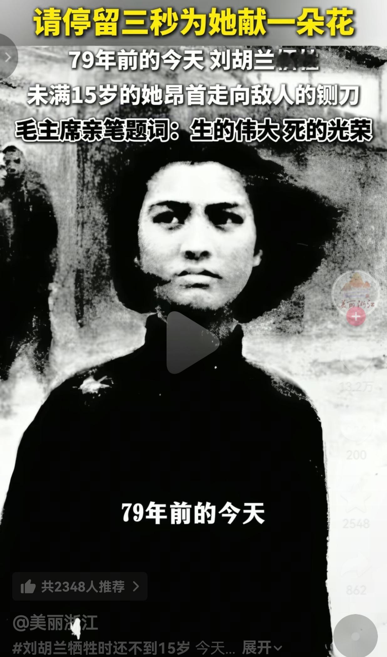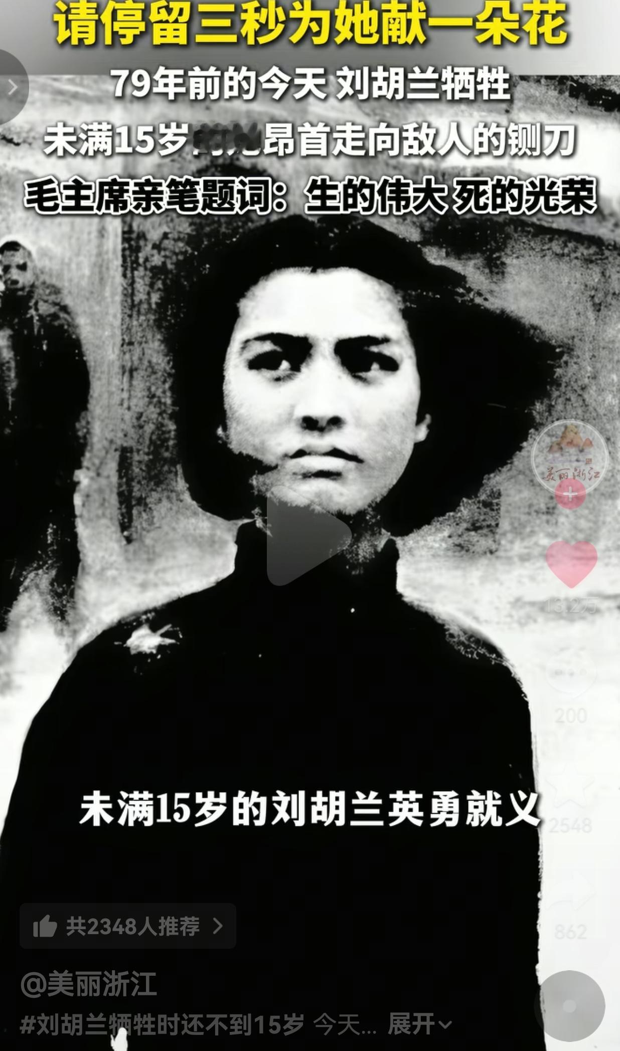 今天是1月12日,79年的今天她英勇就义,如果你有时间请停留三秒,为她献上一朵花,纪念这位伟大的革命烈士。 79年前的1月12日,还没满15周岁的刘胡兰,因叛徒告密落入了敌人手中。 敌人劝她投降,可是,她斩钉截铁地甩出一句:“怕死就不当共产党。”随后便坦然躺在了敌人的铡刀座上,就这样她结束了自己短暂而光荣的一生。 毛主席知道她的光荣事迹后,怀着沉重的心情,亲自为她亲笔题词:“生的伟大,死的光荣”,这八个字,是对她短暂一生最高的褒奖。 据悉,她是已知中国共产党女性烈士中年龄最小的一个,可是她却成了无数人心中永不凋零的英雄。 如今再看她的雕像,挺拔的身姿仿佛还在诉说着当年的不屈,让人心生敬畏。 今天是她牺牲79周年,让我们一起为这位15岁的少女献上一朵花吧,请记住她的名字,记住那段峥嵘的岁月里,曾有这样一位姑娘,用自己的生命照亮了革命的曙光。