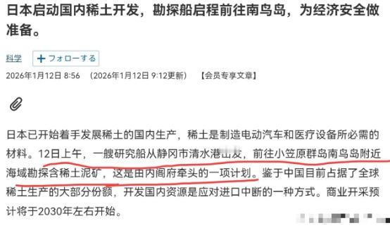 日本态度已明,不会指望中国,日本国内有动作了!1月12日,根据日经新闻报道,就在高市早苗公开表示中国的行为不可接受,管制行为只针对日本之后,日本国内已经有动作了。日媒称,12日上午,一艘日本研究船从静冈市清水港出发,前往小笠原群岛南鸟岛附近海域勘探含稀土泥矿。 高市早苗那番话听着硬气,其实全是装出来的,心里虚得很。她比谁都清楚,日本的经济和军工体系,早就被中国稀土攥住了命门。这些年日本对中国稀土的依赖度一直特别高,表面上直接进口占比就超70%,要是把经第三国转运的也算上,实际依赖度得冲到75%以上。 尤其是镝、铽这些重稀土,日本几乎100%都得从中国进口。更关键的是,全球92%以上的稀土冶炼分离产能都在中国手里,就算日本能从别的国家弄到点原矿,最后还是得送到中国来提纯,从头到尾都绕不开中国这道坎。 日本这次急着派船出海,根源就是中国年初这记精准反制。1月6号,中国商务部直接宣布,禁止所有两用物项对日本军事用户、军事用途出口,覆盖的物项超过900种,不光有稀土,还包括能造导弹、战机的关键材料和技术。 这一下正好戳中了日本的痛处,高市早苗政府这些年一门心思搞“再军事化”,防卫预算一涨再涨,2026财年都涨到了9.04万亿日元,比2018财年增幅快70%。 而这些扩军计划,全得靠从中国进口的两用物项撑着。中国这一管制,等于直接掐住了日本军工扩张的供应链,难怪高市早苗急着跳出来喊话,本质就是慌了神。 可日本这勘探动作看着热闹,实际根本不顶用,甚至有点自欺欺人。南鸟岛附近的稀土泥矿早在2012年就被发现了,当时日本媒体吹得神乎其神,说储量够全球用几百年上千年,可这么多年过去,始终没能真正开采起来。 原因很简单,难度太大、成本太高,根本不具备商业化开采的条件。这次“地球号”要去的海域,水深有5500到6000米,水压高达550个大气压,对开采设备的要求苛刻到了极点。 之前日本只在2500米深海试过水,现在直接挑战翻倍深度,稍微出点差错就可能满盘皆输。而且这片海域刚好在台风高发路径上,海况特别复杂,只要来场大风大浪,作业就得中断,连船只安全都没法保证。 光技术难题就够让人头疼了,经济账更是根本算不过来。这次试采计划要持续三周,总共也就采集35吨泥浆,每吨泥浆大概只能提取2公斤稀土。 可光前期管道调配就花了120亿日元,折合成人民币快5个亿了。要是想规模化开采,后续设备投入、运输、提炼的成本更是个天文数字。 单说提炼环节,深海泥水含水率特别高,脱水消耗的能源就占总产值的60%,还得专门处理钍元素带来的核污染,能耗比中国的冶炼技术高出17倍。就算真能采出来,成本也比从中国进口高太多,根本没有市场竞争力,说白了就是赔本赚吆喝。 日本也不是没试过摆脱对中国的稀土依赖,过去十几年一直在推“稀土多元化”战略,还找了澳大利亚、越南这些国家合作,可到现在依赖度也就降了十几个百分点。 核心原因就是中国稀土产业太成熟了,从开采到冶炼的全产业链优势,再加上能控制低成本,是其他国家和地区短期内根本比不了的。 日本大和综合研究所早就算过账,要是中国稀土供应长期中断,日本GDP可能会下降1.3%到3.2%,汽车等运输机械行业的产出降幅能达到17.6%,还会减少上百万个就业岗位。这对靠制造业立足的日本来说,无疑是致命打击。 日本心里也清楚这条路走不通,可就是不肯认怂。毕竟高市早苗政府一直靠着强硬对华态度拉拢国内右翼势力,现在要是服软,政治上根本交代不过去。 而且还得给美国等盟友表个态,证明自己有能力摆脱对中国的依赖,不是只能跟着别人后面走。可盟友也靠不住,之前日本想和美国联合开发深海稀土,最后也没了下文,这种高难度、高成本的项目,没人愿意真金白银往里砸钱。 高市早苗嘴上说不指望中国,其实就是打肿脸充胖子。日本这次派船勘探,更多是一种无奈的姿态,既想给国内右翼势力一个交代,也想在盟友面前撑住场面。 可现实就摆在这儿,中国的管制精准命中了日本的软肋,而日本所谓的自救方案,不过是镜花水月,根本落不了地。 说到底,日本现在就是进退两难。一方面不甘心被中国掐住供应链,总想靠搞点小动作摆脱依赖;另一方面又没有足够的技术和经济实力实现自主,只能在焦虑里硬撑。 高市早苗的强硬表态改变不了现实,南鸟岛的勘探也救不了日本的困境,反而暴露了日本右翼势力想搞军事扩张,却处处受制的尴尬。 接下来日本大概率还会折腾类似的动作,可只要中国牢牢守住稀土产业链的优势,守住安全底线,日本再怎么蹦跶,也跳不出被牵制的格局。它嘴里所谓的“不指望中国”,终究只是自欺欺人的空话。