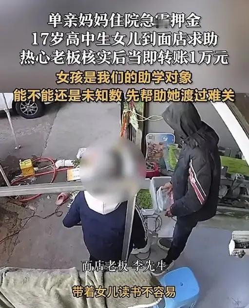 破防了!浙江,一单亲妈妈住院急需押金,17岁女儿跑到面店求助,谁知,老板明知还款没把握,依然给女孩转了10000元,老板:“先帮她渡过难关!”网友:这老板想不发财都难! 李先生是当地临街一家面店的老板,因为附近有医院有学校,所以他的生意还行,尽管如此,不管顾客多或少,他都耐心、热情地对待每一名顾客。 那天早上,李先生正在面店门口给一名顾客煮面条,当他微笑着询问对方是否需要辣椒时,后面又来了一个穿高中校服的女生,看起来应该有十七八岁的样子。 女生就站在面店台阶下,手攥着校服衣角捏得发白,脚还不停蹭着地面,眼睛红通通的,半天没敢开口,就直勾勾看着李先生煮面的动作,那副手足无措的样子,跟周围来来往往的路人完全不一样。李先生余光扫到她,一开始以为是学生来买面,还扬声问了句要吃什么口味,可女生只是摇了摇头,嘴唇动了动,声音细得跟蚊子叫似的,压根听不清说啥,李先生这才察觉不对劲,关了小火站了起来,走到她身边问咋回事。 女生被这么一问,眼泪瞬间就掉下来了,一边抹眼泪一边断断续续说,妈妈是单亲妈妈,早上突然肚子疼得直不起腰,被邻居送到附近医院,医生说要紧急做手术,光押金就要一万块,她翻遍了家里的抽屉,只凑出两千多,亲戚都在外地,一时半会儿联系不上,她抱着试试的心思跑出来求助,沿路问了好几家店,没人敢帮她,看到李先生的面店人多,老板看着面善,才硬着头皮过来。她说这些话的时候,手还不停抖,掏出手机给李先生看医院的缴费单,上面的金额清清楚楚,还有医生的紧急通知。 李先生听完没半点犹豫,先把女生拉进面店,给她倒了杯热开水,让她先冷静冷静,自己转身就掏出手机,问了女生的收款码,直接转了一万块过去,女生看到手机到账提醒,当场就哭着给李先生鞠躬,还说会写欠条,以后放学就来面店打工还钱,哪怕洗盘子刷碗都行。李先生赶紧扶她起来,说欠条啥的都不用,先回医院给妈妈办手续,钱的事以后再说,还顺手装了一碗刚煮好的热汤面,塞到女生手里,让她路上吃点东西,别饿坏了身子。 旁边吃面的顾客都看呆了,有人悄悄跟李先生说,这单亲妈妈看着就是打零工的,家里条件肯定不好,一万块不是小数目,这钱借出去,能不能还上真不好说,别好心被人骗了。李先生只是摆了摆手,继续给顾客煮面,他说自己开店这么多年,见多了医院门口的难处,这姑娘还是个孩子,能鼓起勇气出来求助,肯定是走投无路了,总不能看着人家妈妈等着手术没钱治,钱没了可以再赚,人要是没了,这孩子这辈子都有遗憾。 没人知道,李先生的面店看着生意还行,其实赚的都是辛苦钱,一碗面也就赚个几块钱,凌晨四点就要起来揉面熬汤,忙到晚上十点才关门,一万块钱,是他起早贪黑小半个月的纯营收,他自己家里也有上学的孩子,深知做父母的不容易,更看不得孩子这么小就扛起这么大的事。他当时压根没考虑过还钱的事,脑子里就一个念头,先帮孩子渡过难关,其他的都不重要。 女生赶回去后,很快给李先生发了消息,说妈妈已经进手术室了,还拍了手术室的照片,字里行间全是感谢。后来女生妈妈手术成功,出院后第一件事,就是带着女儿拎着水果去面店道谢,还把一万块钱一分不少还给了李先生,母女俩非要给李先生塞红包,被他婉拒了,他说能帮上忙就好,红包真不用,要是实在过意不去,以后常来吃面就行。 这事被去吃面的顾客发到网上,一下子就火了,网友们都被李先生的善良暖到了,有人说这才是人间大爱,小老板有大格局,明知没把握还钱还肯出手相助,这份心意比啥都珍贵;还有人说李先生心善,做生意讲良心,待人又热情,这样的老板想不发财都难。甚至有不少附近的居民和学生,专门绕路来李先生的面店吃面,就为了支持一下这位好心的老板,面店的生意比之前更红火了。 其实这年头,不少人遇到别人求助,都会多留个心眼,怕被骗怕吃亏,可李先生的做法,让大家看到了善意的力量,善意从来不是算计着回报,而是发自内心的想帮人一把。一碗热面,一万块钱,看似平常的举动,却藏着最珍贵的人情味,这世上从来都不缺艰难的时刻,缺的是愿意伸手拉一把的人。李先生只是个普通的面店老板,没什么大本事,却用自己的行动,给这个世界添了一份温暖。 各位读者你们怎么看?欢迎在评论区讨论。