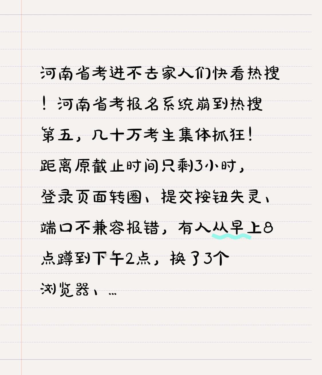 河南省考进不去 家人们快看热搜!河南省考报名系统崩到热搜第五,几十万考生集体抓狂!距离原截止时间只剩3小时,登录页面转圈、提交按钮失灵、端口不兼容报错,有人从早上8点蹲到下午2点,换了3个浏览器、4种网络,饭都没吃还没进去,备考大半年难道要栽在报名上?别急!官方刚刚发重磅通知,现在看还能救! 先说说这崩溃现场有多真实:郑州考生晒截图,页面始终显示“安全性提示”,Chrome直接提示不兼容;洛阳应届生吐槽,昨天卡在填写页,今天连登录界面都加载不出来;还有人好不容易填完信息,一点提交直接跳错误页,重新登录啥都没了!截至1月10日,报名人数已破24万,最热岗位837:1抢破头,可这新换的报名系统,连基本的端口标准都没做好,咨询电话还常年占线,考生们哭着吐槽:“官方提前预警别掐点,却不扩容服务器,这不是甩锅吗?” 重点转折来了!就在大家绝望之际,河南省公务员局16点刚发通知:报名时间紧急顺延48小时!原定1月12日17点截止,现在延长到1月14日17点,缴费和改报时间也同步顺延!不用再熬夜卡点冲刺了,但系统可能还会拥堵,这6个亲测有效的救命技巧,照着做直接提升80%成功率: 第一,浏览器必须选对,IE11以上或360极速模式,Chrome要开兼容模式,关掉防火墙避免报错;第二,换网络别死磕wifi,手机开5G或连有线网,关掉下载、直播等占带宽程序;第三,精准刷新不瞎点,回到省人事考试中心首页重走报名入口,别狂按F5加重服务器压力;第四,分批保存防丢失,每填1-2项就点“保存草稿”,个人信息提前存好直接复制粘贴;第五,多开备用窗口,同时登官网和地市专用入口,比如郑州考生可直接进zhengzhou.gov.cn专栏;第六,卡壳立刻找官方,技术咨询电话0371-61612719,驻马店0396-2817649、济源0391-6610352,打不通就拨12333人社热线 。 还要避坑3个关键雷:别信第三方链接,只认准“河南省人事考试中心”官网,避免信息泄露;照片必须用官网工具处理,不然提交必失败;别等最后几小时再试,就算延期了,早报名早安心,还能预留改报时间。另外提醒,报名成功后一定要截图存证,1月16日开始缴费,每人每科30元,考点尽早选,热门城市满了就只能去外地考。 最后想对所有考生说,备考路上的苦只有自己懂,每天刷题到凌晨,背时政背到嗓子哑,没人想因为系统问题留下遗憾。现在官方延期的福利来了,别再焦虑崩溃,按技巧慢慢操作,把时间花在核对岗位信息上,冷门岗还有捡漏机会。愿每个为梦想拼尽全力的你,都能顺利报名,3月14日笔试超常发挥,成功上岸!觉得有用的赶紧转发给考友,评论区扣“上岸”沾喜气,说说你卡了多久才进去~