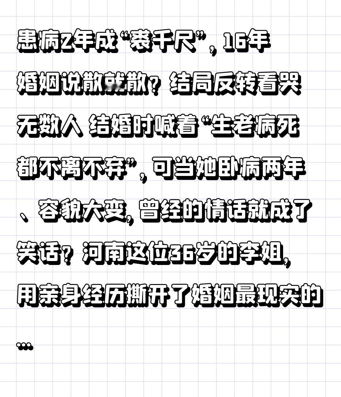 患病2年成“裘千尺”,16年婚姻说散就散?结局反转看哭无数人 结婚时喊着“生老病死都不离不弃”,可当她卧病两年、容貌大变,曾经的情话就成了笑话?河南这位36岁的李姐,用亲身经历撕开了婚姻最现实的一面。 谁能想到,16年相濡以沫的夫妻,竟敌不过一场白癜风的考验。两年前,李姐身上冒出零星白斑,她一边带娃做家务,一边硬扛着治疗,可丈夫全程冷眼旁观,连句安慰都没有。病情越来越重,白斑蔓延到脸上头皮,连孩子都被同伴嘲笑“妈妈像裘千尺”,她的世界彻底崩塌了。更让人心寒的是,当她最脆弱的时候,丈夫递来的不是温暖,而是冷冰冰的离婚协议书:“你这样太拖累人,日子没法过了”。 娘家人怕她添麻烦避之不及,李姐孤零零躺在病床上,看着镜中陌生的自己,连死的心都有了。可就在她以为人生只剩黑暗时,转折点突然出现——离婚半年的前夫竟提着保温桶出现在病房,放下工作请了长假,每天擦身喂药、按摩翻身,把所有繁琐的护理都包了下来,病友们都以为他们是恩爱夫妻。 有人忍不住问他图啥,前夫红着眼眶说:“离婚是缘分尽了,但良心还在,她难的时候我不能不管”。原来他从朋友那得知李姐无人照料,当即放弃了再婚计划,赶回来撑起了她的天。更让人暖心的是,律师告诉李姐,根据《民法典》,夫妻有相互扶养义务,离婚时一方生活困难,另一方必须给予适当帮助。最终前夫不仅承担了部分医疗费,还承诺会照顾到她康复 。 疾病从来都是婚姻的试金石,有人选择逃离,有人却用行动诠释担当。李姐的遭遇让我们看清:婚姻里最珍贵的不是花前月下的浪漫,而是风雨来袭时的不离不弃。那些“同甘共苦”的誓言,不该只在顺境时生效;所谓夫妻,本就该是彼此的退路和铠甲。 如果你也觉得夫妻本该患难与共,欢迎点赞转发,让更多人看到这份迟到的温暖。也来说说,你觉得婚姻中最重要的是什么?评论区等着你的观点~