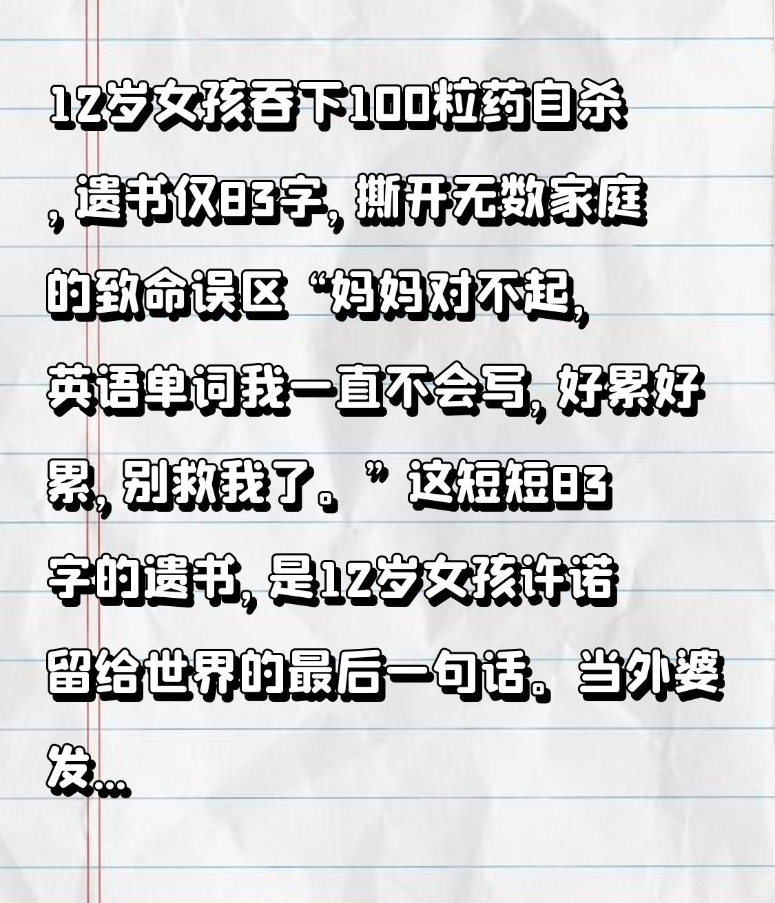 12岁女孩吞下100粒药自杀,遗书仅83字,撕开无数家庭的致命误区 “妈妈对不起,英语单词我一直不会写,好累好累,别救我了。” 这短短83字的遗书,是12岁女孩许诺留给世界的最后一句话。当外婆发现她时,孩子已经吞下整瓶心脏病药,面色青紫倒在书桌前,铺满一地的作业还没写完。 谁能想到,这个曾获评“优秀少先队员”的开朗女孩,会以如此决绝的方式告别世界?事发当天,许诺因肠胃炎请假在家,妈妈在外地住院,她还特意打电话叮嘱妈妈“注意身体”,可转身就选择了轻生。垃圾桶里的空药瓶、书桌上的遗书,成了这场悲剧的唯一注脚。 更令人揪心的是,这场悲剧还牵扯出一场家校纠纷。妈妈马繁星认为,女儿长期因英语成绩差被老师批评,还遭受同学嘲笑“胖”,学校未尽到监管责任;可老师却委屈辩解,从未单独体罚过许诺,只是和其他同学一起辅导过几次作业,自己甚至因此被迫辞职,连办公电脑都没敢带走。 一审法院最终驳回了妈妈的诉讼请求,认为自杀是多元因素导致,学校难以预见。但这场判决并没有让争议停止,反而撕开了一个残酷真相:孩子的崩溃从来都不是突然的。许诺的遗书中,“日复一日的学习”“不会写的英语单词”“被嘲笑胖”,每一个细节都是压垮她的稻草,而这些信号,却被家长和老师都忽视了。 很多家长总觉得“小孩子哪有压力”,把孩子的情绪低落当成“矫情”,把沉默寡言归为“叛逆”。可数据不会说谎,我国青少年抑郁症发病率已达5%-10%,68%的抑郁患儿曾被家长误解。许诺生前就经常向同学抱怨焦虑,可妈妈却因为没接到老师的沟通电话,误以为孩子一切安好,直到悲剧发生才追悔莫及。 其实孩子的求救信号早就藏在细节里:对喜欢的事失去兴趣、反复说“好累”、自我否定、睡眠或食欲变化,这些都是他们在向世界求助。就像心理专家说的,儿童抑郁不是“熬一熬就过去”的情绪,而是需要重视的心理疾病,早期干预的黄金期只有6个月。 作为家长,我们总在焦虑孩子的成绩,却忘了问他们“开不开心”;总在要求他们“更优秀”,却没教会他们如何面对挫折。许诺的悲剧给所有家庭敲响警钟:孩子的心理健康永远比分数重要,一句“没关系,妈妈陪你”,可能比十句“你要加油”更有力量。 每个孩子都在努力长大,他们需要的不是完美的期待,而是被接纳的勇气。如果我们能多一点耐心倾听,少一点指责说教,或许就能接住那些正在崩溃的孩子。 你觉得家长和学校该如何守护孩子的心理健康?欢迎在评论区留下你的观点,点赞转发,让更多人重视青少年心理问题,别让悲剧再发生!