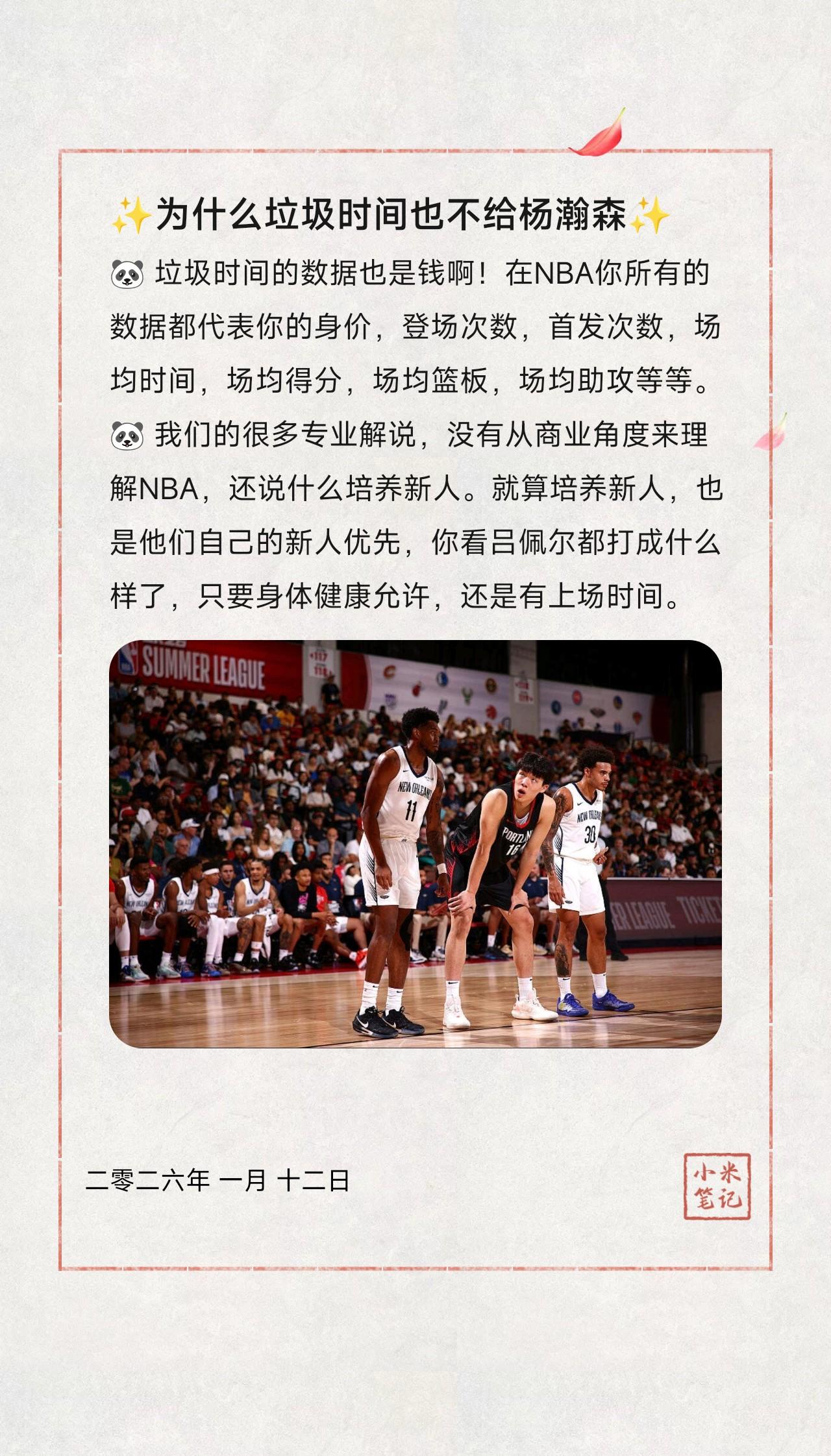 🐼 垃圾时间的数据也是钱啊!在NBA你所有的数据都代表你的身价,登场次数,首发次数,场均时间,场均得分,场均篮板,场均助攻等等,都会折合成你到底拿到多少薪资。 🐼 我们的很多专业解说,没有从商业角度来理解NBA,还说什么培养新人。就算培养新人,也是他们自己的人优先培养,你看吕佩尔都打成什么样了,只要身体健康允许,还是有上场时间。 🐼 也不用替杨瀚森喊冤抱屈,杨瀚森登场时间已经算是可以的了,起码他有14亿人的大市场的加持。要不然,你看看那些来自非洲的兄弟,他们哪有上场时间。没有背景就是不行啊。 🐼 连球队大核阿夫迪亚想要进全明星,都要求助小老弟在中国粉丝中拉拉票,比赛中也给杨瀚森传两个球。杨瀚森应该利用好自身的这些优势。踏踏实实在开拓者队练级。能做到没有被裁掉的危机,这已经羡煞旁人了。 作者:龙须面🧐