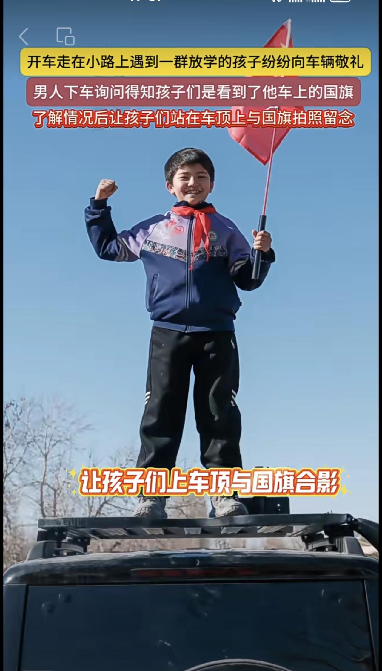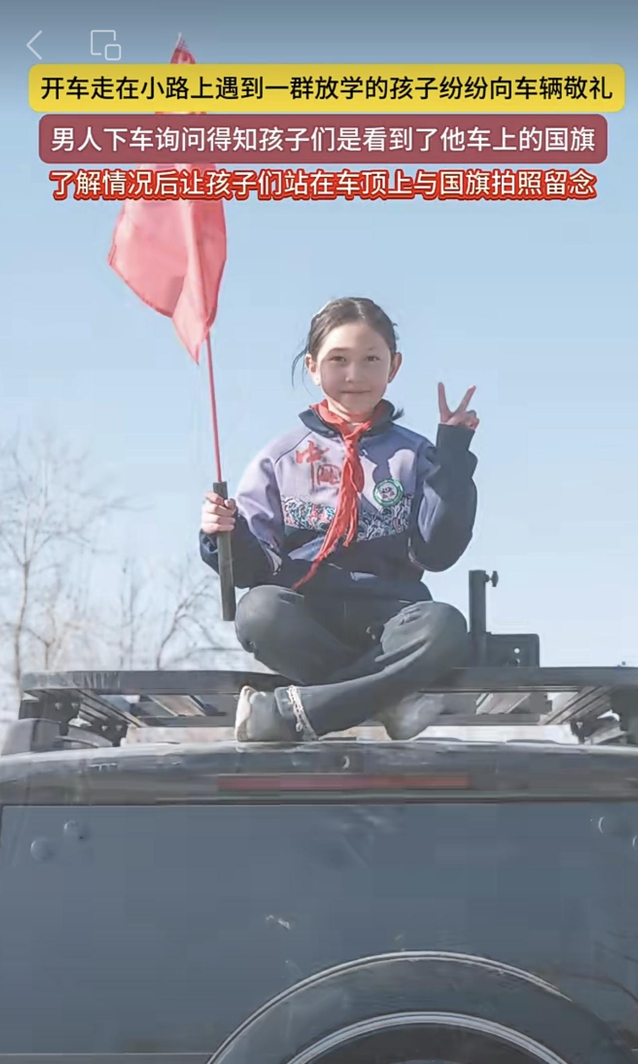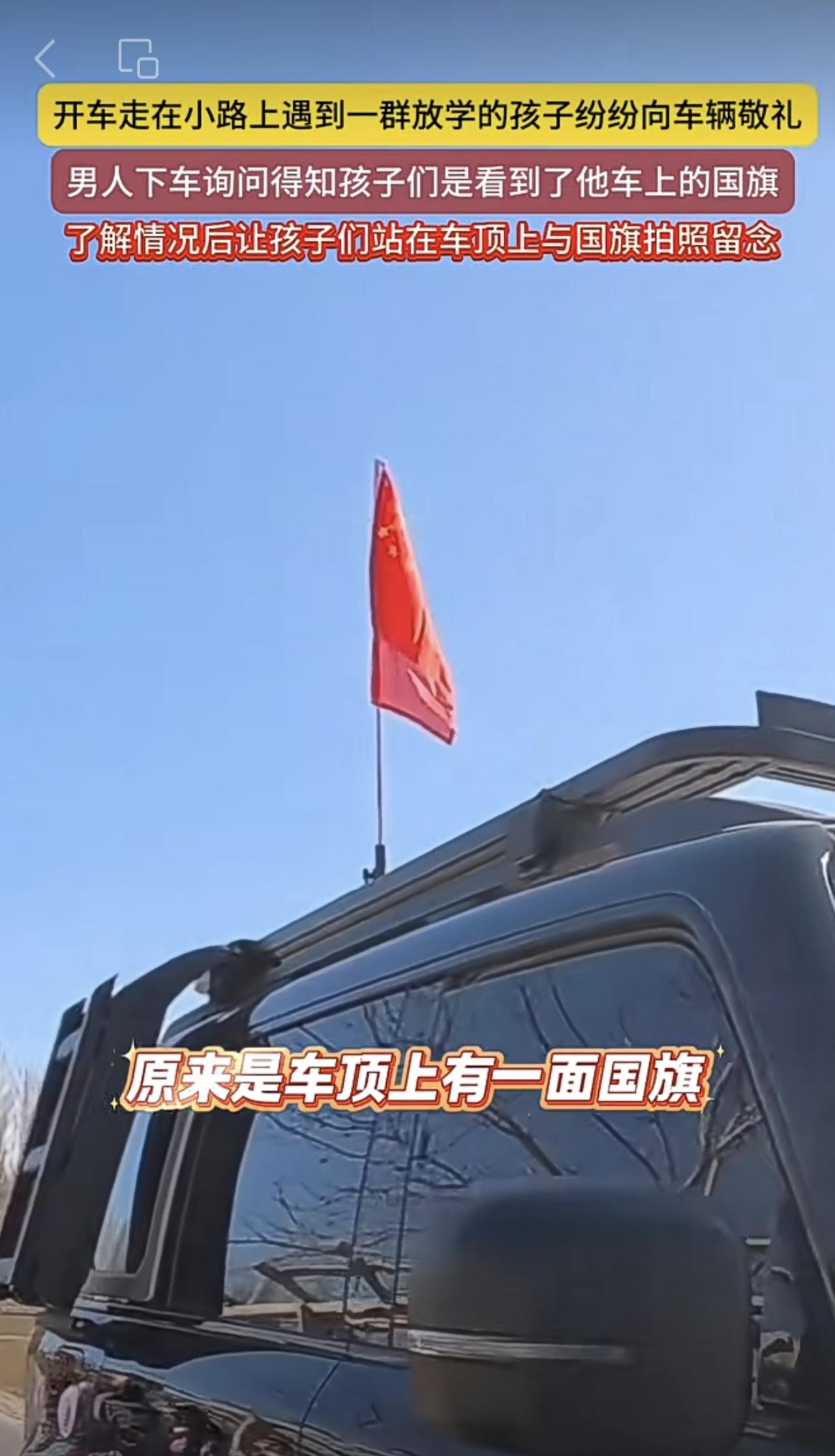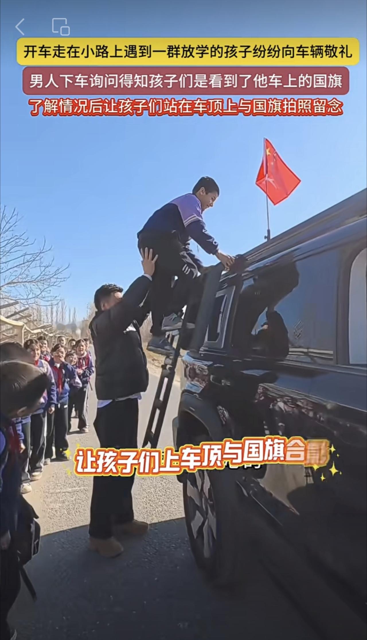 开车走在小路上遇到一群放学的孩子纷纷向车辆敬礼,男人下车询问得知孩子们是看到了他车上的国旗,了解情况后让孩子们站在车顶上与国旗拍照留念(编辑:朝旺)