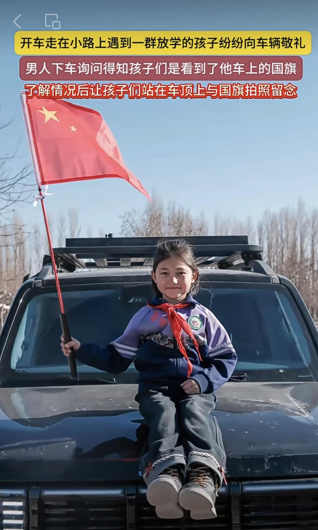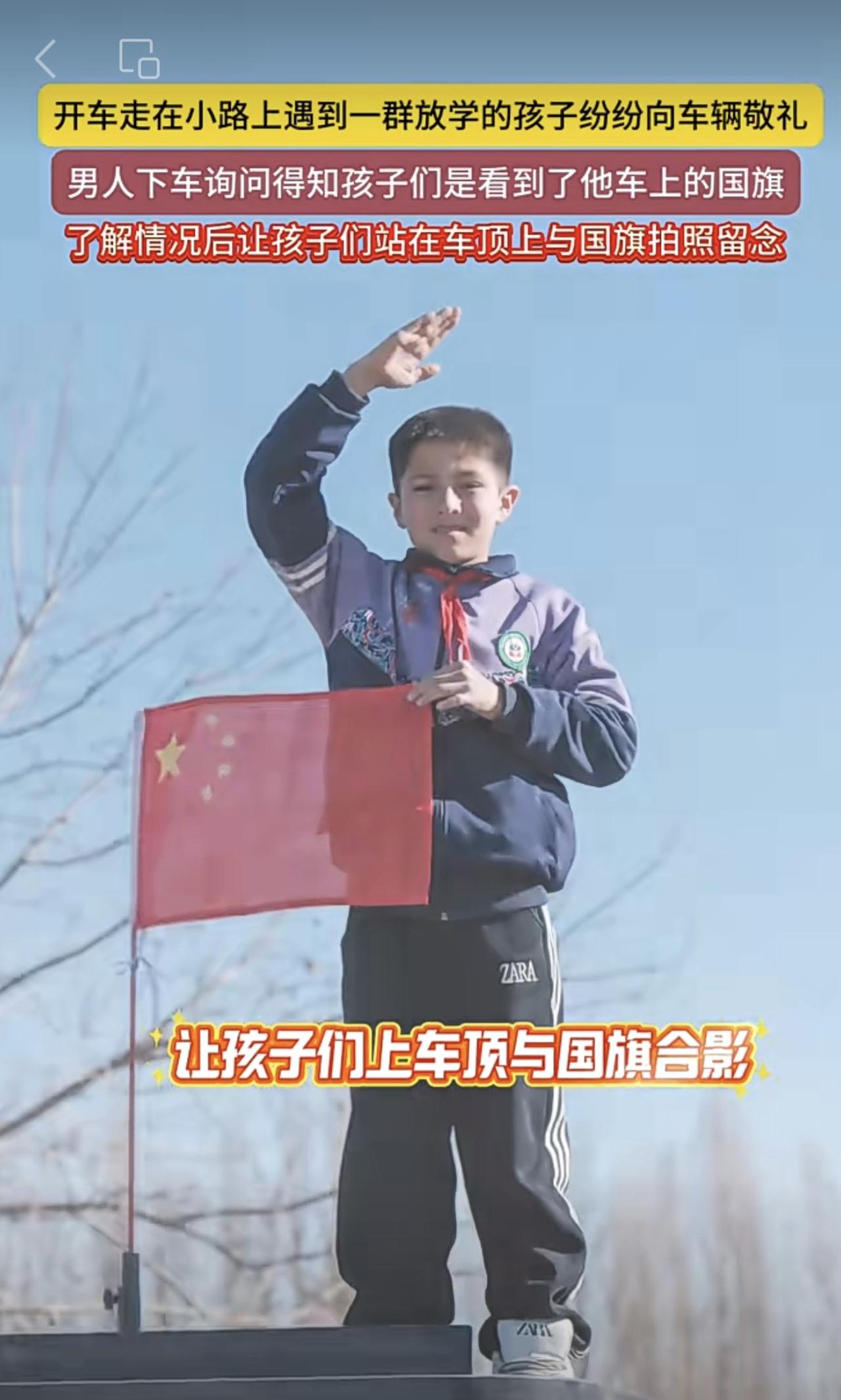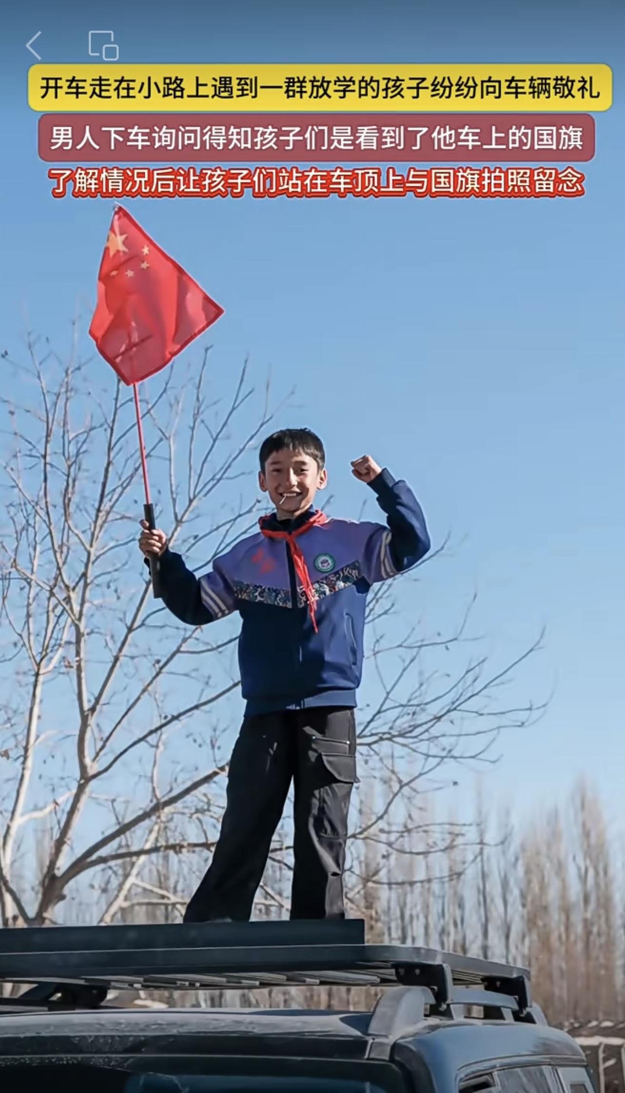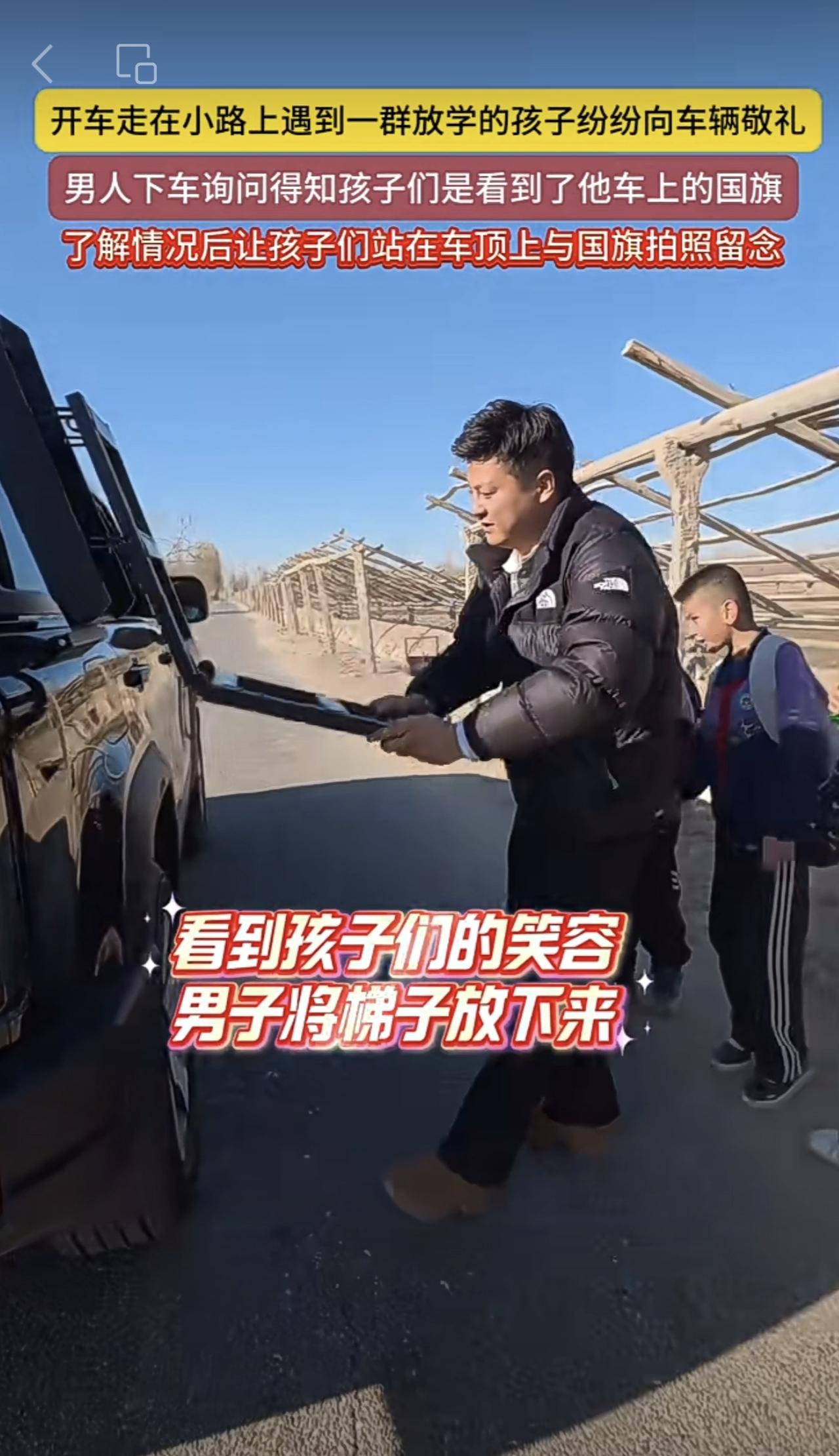 开车走在小路上遇到一群放学的孩子纷纷向车辆敬礼,男人下车询问得知孩子们是看到了他车上的国旗,了解情况后让孩子们站在车顶上与国旗拍照留念(编辑:朝旺)