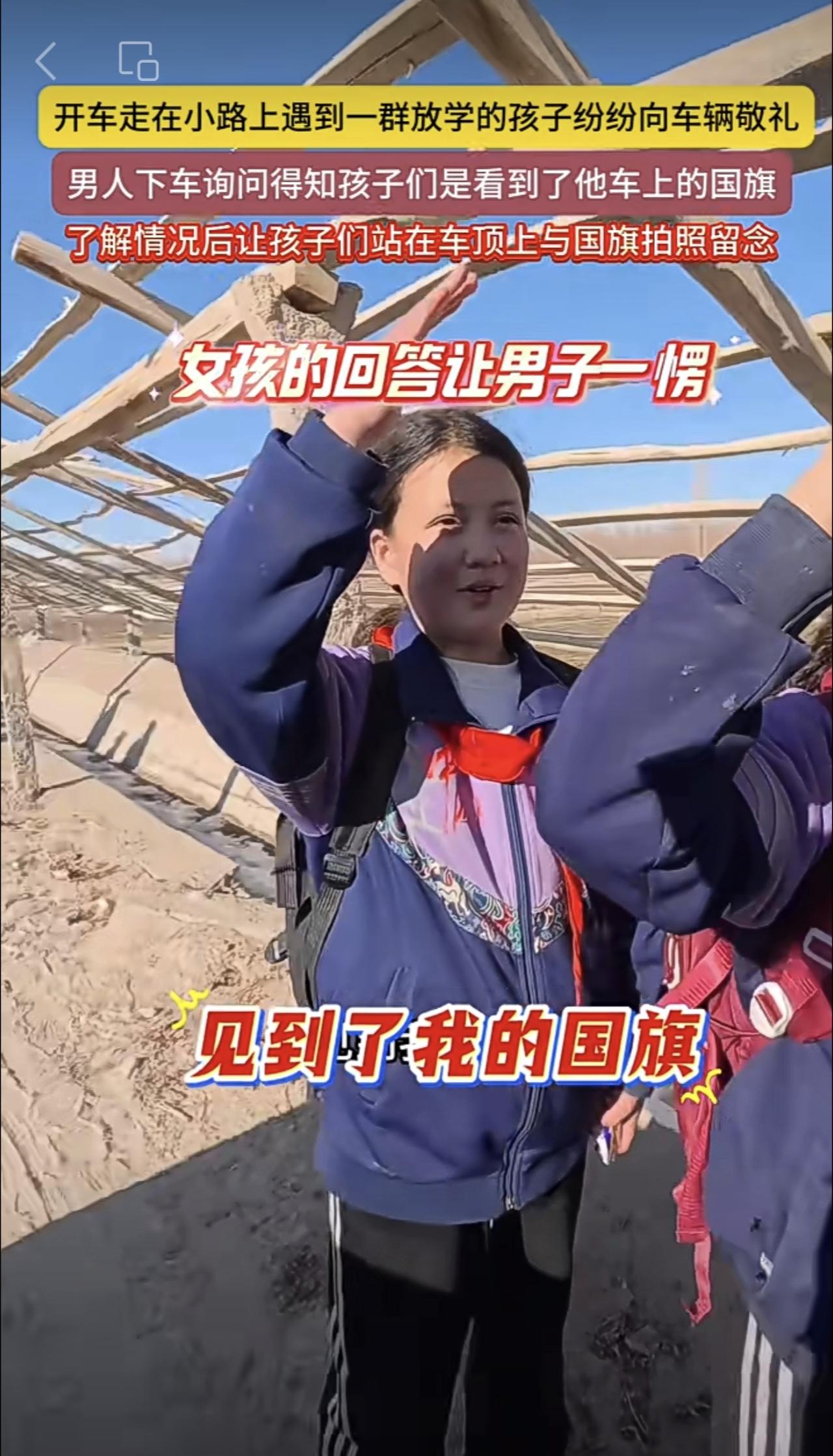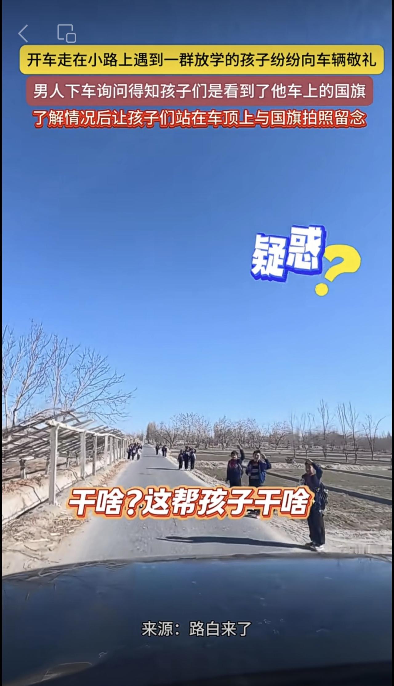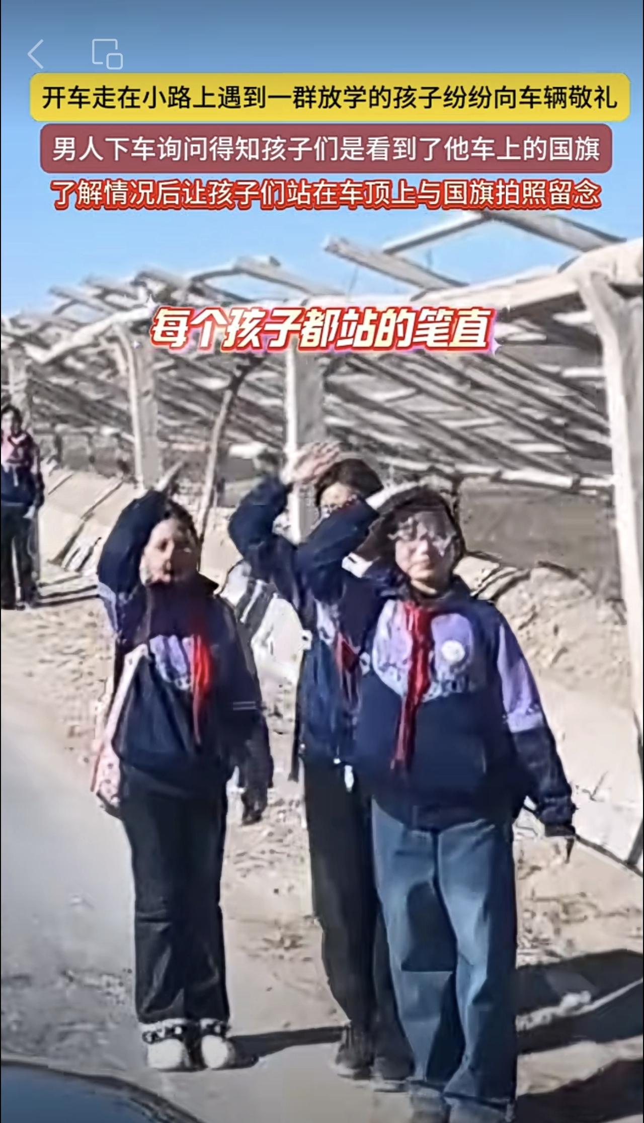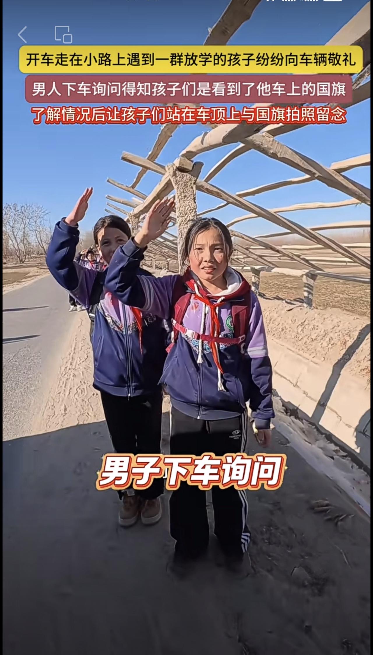 开车走在小路上遇到一群放学的孩子纷纷向车辆敬礼,男人下车询问得知孩子们是看到了他车上的国旗,了解情况后让孩子们站在车顶上与国旗拍照留念(编辑:朝旺)