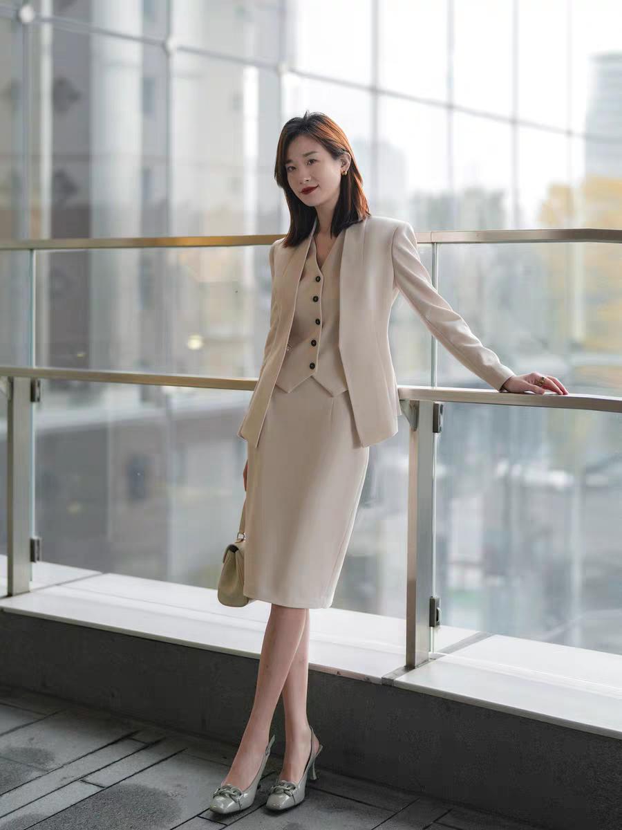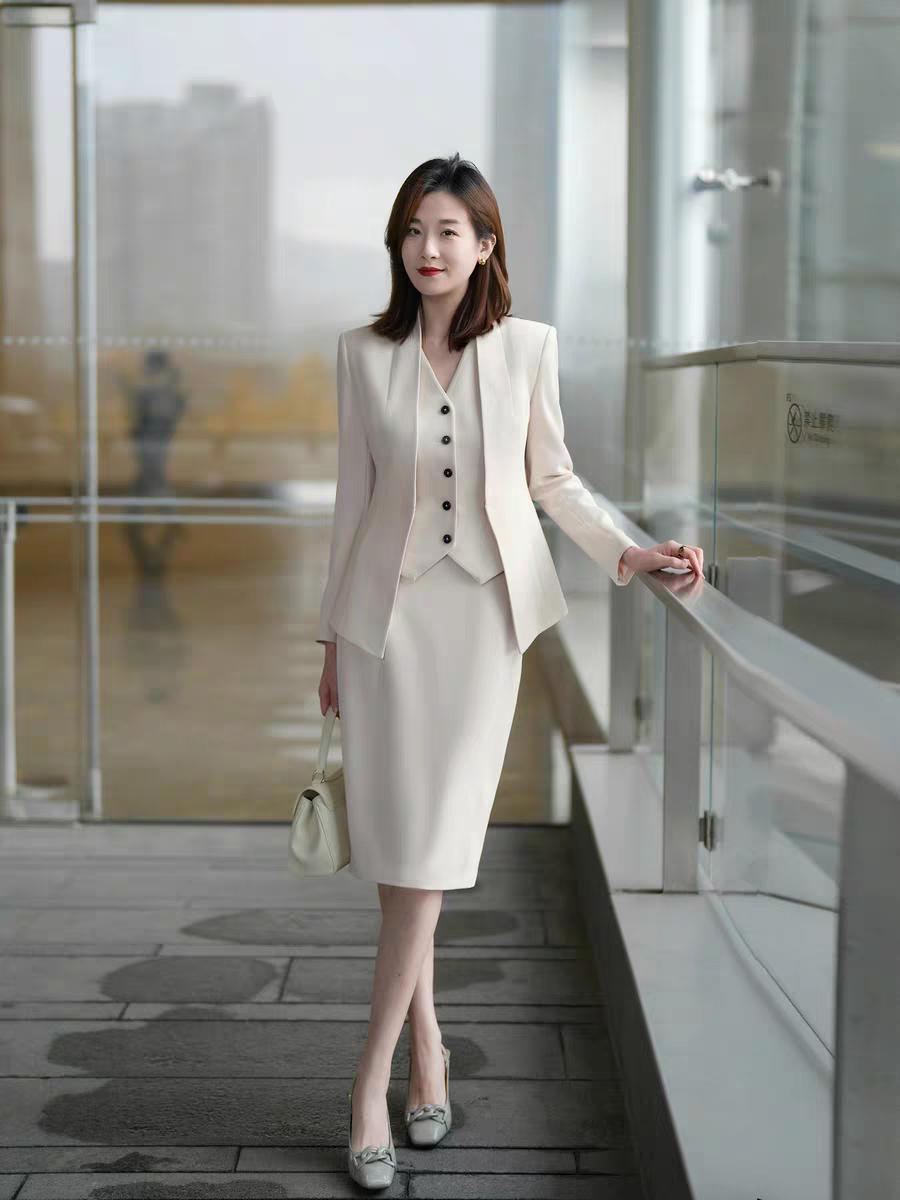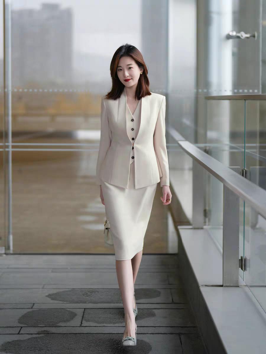 OL包臀半身裙气质云水白西装三件套。收腰显瘦!