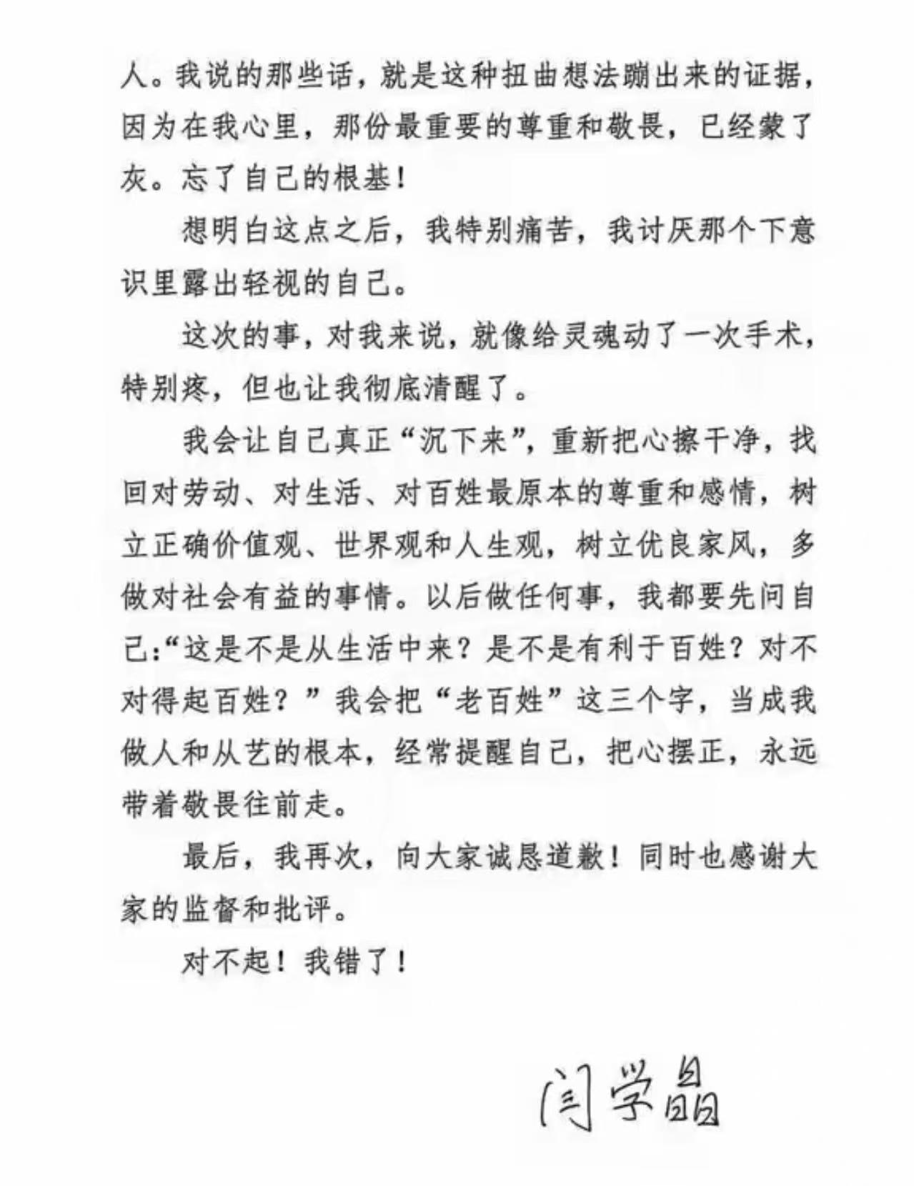 闫学晶道歉了……她发文致歉:我讨厌那个下意识里露出轻视的自己!但网友并不买账,有网友说:“那不是下意识,那是真正的你!道歉是害怕赚不到钱了,我还是喜欢你那桀骜不驯的样子!” 闫学晶发文说:“事情刚出来那一两天,我整个人是懵的。看到网上那么多人说我,我第一反应是惊讶,委屈,但等我真正鼓起勇气,仔细看大家的批评时,才一下子被戳醒了。那些留言句句扎心:“你忘了你的根在哪儿了!”之前那点委屈,立马变成浑身发凉。 我从小在普通家庭长大,是父老乡亲和生活的烟火气喂大了我的艺术生命。我一直以为我都记得,不会忘。可实际上时间长了,环境变了,听着掌声,捧着鲜花,慢慢习惯了被人捧着,却忘了本,我见了更大的世面,却不知不觉把这当成了一种"优越感",忘了自己的过去。我把人民,把百姓当成了两个模糊的"词",而不是活生生的,值得尊敬的,和我连着根的人。 想明白这点之后,我特别痛苦,我讨厌那个下意识里露出轻视的自己。 这次的事,对我来说,就像给灵魂动了一次手术,特别疼,但也让我彻底清醒了。 我会让自己真正"沉下来",重新把心擦干净,找回对劳动,对生活,对百姓最原本的尊重和感情,树立正确价值观,世界观和人生观,树立优良家风,多做对社会有益的事情。 最后,我再次,向大家诚恳道歉!同时也感谢大家的监督和批评。对不起!我错了! 此事引发热议,有网友说,闫学晶道歉了,大家就应该放过她,得饶人处且饶人,另外她的初衷并不是想伤害谁,只是说了一些错话,大家不要把所有的不如意去让一个人承担。 也有网友说,闫学晶:看到钱袋子被掐了!没办法而已!只是向人民币真心道歉!普通的老百姓在你眼里算个锤子啊! 还有网友说,这是怕儿子被查吗?我觉得不论真假,全部查一遍,给全国人民一个交代,清者自清,浊者自浊。道歉了也不能就此结束!查个明明白白! 闫学晶的道歉,不是忏悔,是代言掉单、账号被封、儿子前途受阻的恐慌。如果真的觉得错了,早就站出来道歉了! 嘴上说着“讨厌那个下意识露出轻视的自己”,可那哪是什么“下意识”? 分明是长期浸泡在名利场后,骨子里长出的傲慢! 当她说“儿子拍一部戏才挣几十万,养家都难”时,眼里根本没有普通人的存在! 在月薪三千还要还房贷的年轻人面前,在为孩子学费发愁的父母面前,在送外卖摔断腿都不敢歇一天的打工人面前,“几十万不够花”不是口误,是赤裸裸的阶层羞辱。 更讽刺的是,她一边忏悔“忘了根”,一边住着北京大平层、三亚海景房。 一边说“把百姓当成了模糊的词”,可她的“百姓”只出现在致歉信里,从没出现在她对高片酬、天价代言、特权入学的反思中。 网友说得对:这不是真心悔改,是钱袋子被掐疼了才低头。 要是品牌没解约、平台没限流、儿子没卷入“中戏新疆班”风波,她会道歉吗? 恐怕还在直播间里,一边叹“日子难过”,一边收着高额的坑位费。 别拿“灵魂动手术”来美化自己的狼狈。真正的清醒,不是写一篇文采斐然的检讨,而是把“优越感”换成同理心,把“哭穷炫富”换成沉默谦卑。 否则,这封道歉信,不过是给“德不配位”的明星生涯,贴上一张廉价的遮羞布罢了。 人民不需要你“重新尊重”,人民只希望你——少一点表演,多一点自知之明;少一点凡尔赛,多一点做人底线。 否则,就算你说一万遍“对不起”,也洗不掉那句“几十万不够花”里,透出的冰冷与荒唐。