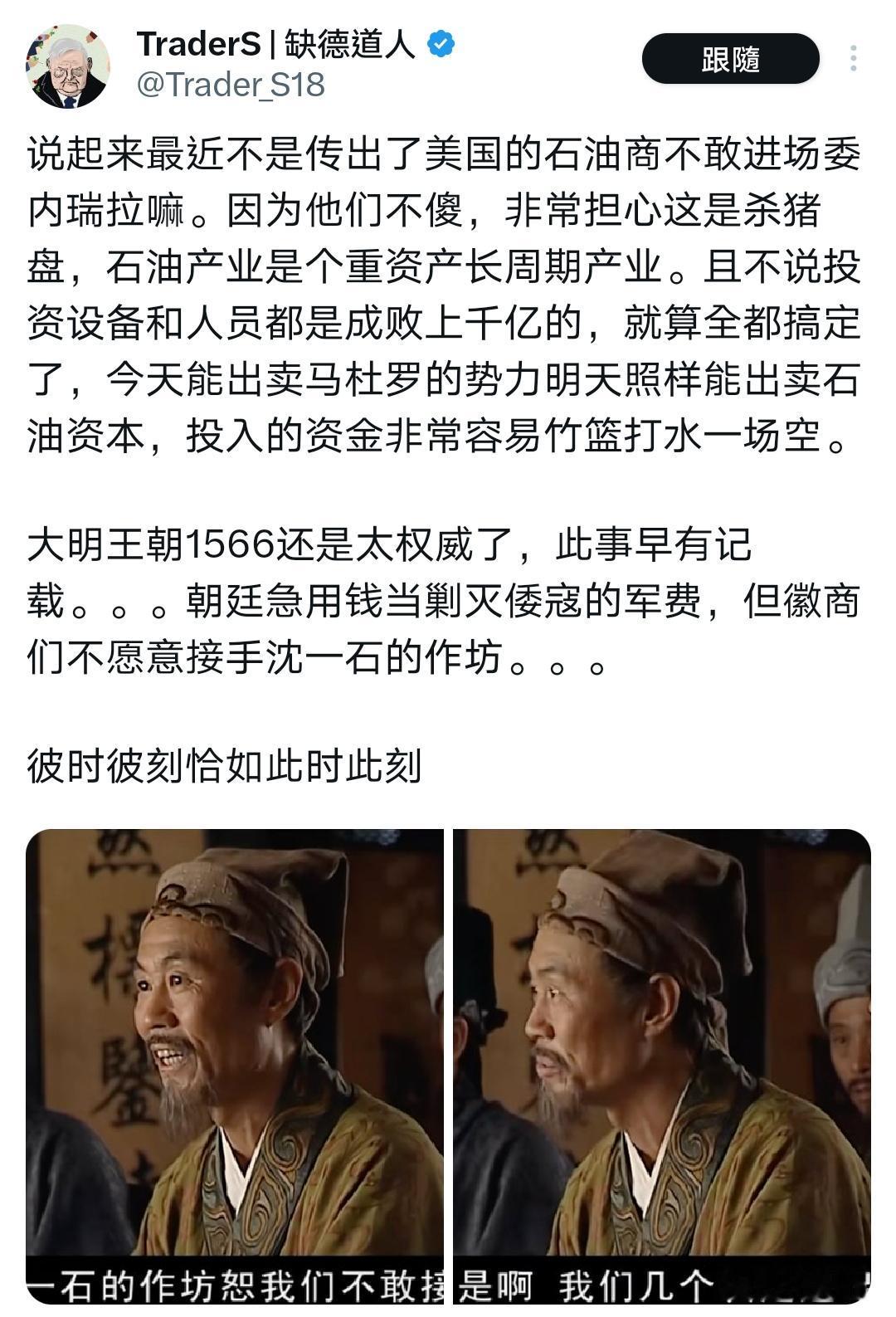 我对某岛内名嘴的陈见很深吗? 有网友给我留言说,我对某岛内名嘴有很深的成见。可是我对他的批评,并来不是基于个人好恶,而是对他的观点的不认可。 不管是近期他对格陵兰的观点,还是对委内瑞拉的观点,(包括以前的很多很多)我都极不认可。而且我非常确定,他对中国历史的了解并不深入,更谈不上他自封的“历史学家”。 不管是古代皇权还是现代地缘政治,当 “权力” 直接插手商业,资本都会怕 “被收割”—— 因为商业需要稳定的规则,而权力的逻辑是 “利益优先、随时调整”。沈一石的作坊是 “皇权的工具”,委内瑞拉的石油是 “美国地缘的棋子”,接盘的资本都只是 “临时耗材”。 没有看过《大明王朝1566》,总知道沈万三、胡雪岩吧? Source: X