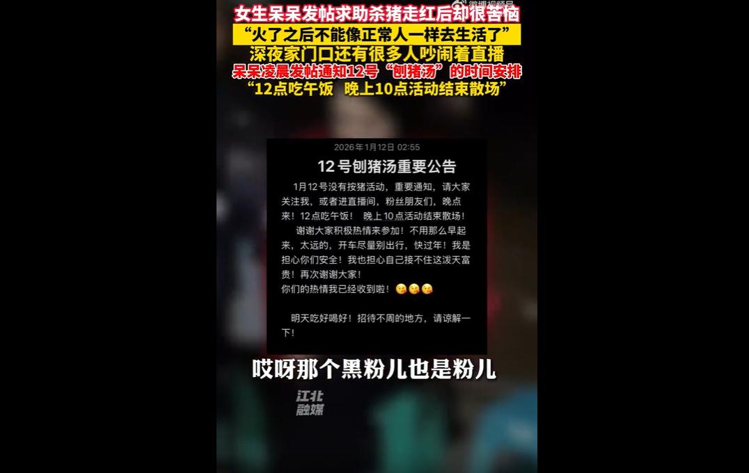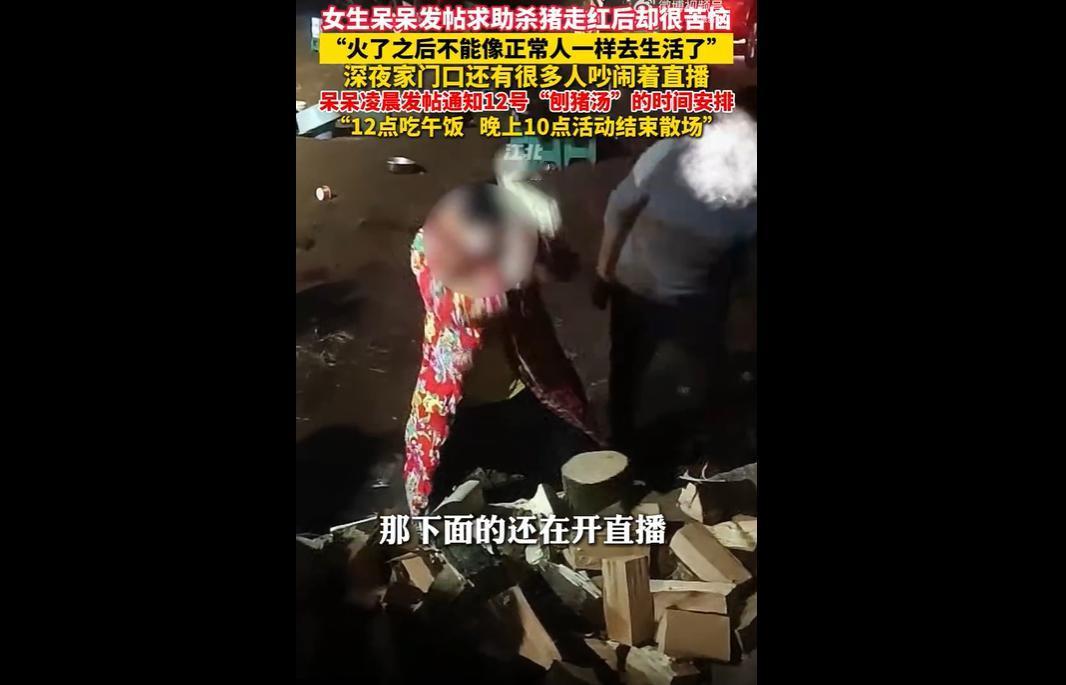 重庆女子呆呆求助杀年猪意外走红,吸引千人线下聚集、十万人线上围观。 她近日发文称不堪其扰,深夜仍有人在门口吵闹直播,严重影响生活。 她拒绝带货,仅想宣传家乡,并宣布活动限时结束,希望回归平静。 呆呆的遭遇,是一场典型的 “流量反噬”。 原本只是一次淳朴的求助,却因流量的涌入演变成一场失控的狂欢。 这不仅打乱了她原本平静的生活,也让那份乡村的质朴被过度消费。 网友们带着猎奇心理蜂拥而至,将呆呆的家变成了免费的 “网红打卡点”。 深夜的吵闹直播,无视主人的休息权利,这种打着 “喜欢” 旗号的骚扰,本质上是一种对他人生活空间的侵犯。 我们在享受网络热闹的同时,不能忘了尊重当事人的意愿,热闹过后的一地鸡毛,不该由被围观者独自承担。 不过,呆呆在流量变现的巨大诱惑面前,她保持了难得的清醒,坚持初衷只为宣传家乡,而非利用热度牟利。 这种不被流量裹挟的定力,在当下浮躁的网络环境中显得尤为珍贵。