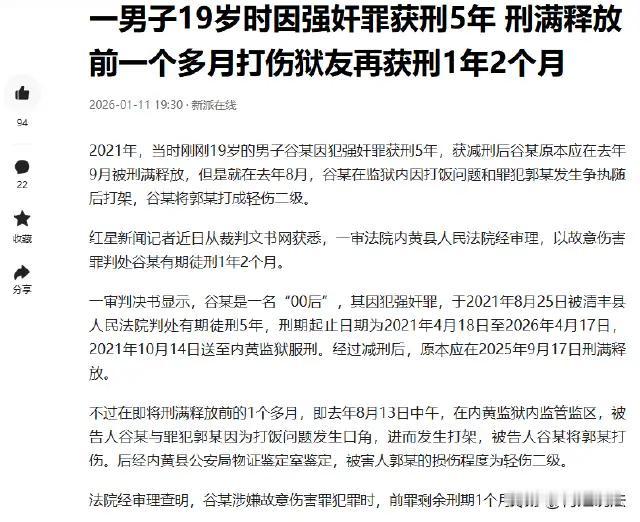 **他离自由只剩32天,却一拳把自己打回深渊。** 河南安阳内黄县,00后谷某的人生像一场不断重启的悲剧。 19岁那年,因强奸罪被判五年,送入监狱服刑。 本该是人生最懵懂也最关键的五年,他在高墙内度过。 但法律给了他一次机会——表现良好,减刑成功,**2023年9月就能重见天日**。 可命运在最后一刻急转直下。 2023年8月的一顿午饭,他和狱友为打饭顺序争执几句,情绪失控,一拳砸了过去。 对方倒地,鼻骨骨折、脑震荡,伤情鉴定:**轻伤二级**。 于是,新的判决来了——**故意伤害罪,加刑一年两个月**。 他出狱的日子,从“下个月”变成了“再等一年多”。 消息传出,网友炸锅:“32天!就差32天啊!” 有人唏嘘:“他是不是已经闻到了自由的味道,反而绷不住了?” 也有人冷言:“这种人就不该减刑,出来也是隐患。” 但我们更该问的是: 一个正在接受改造的年轻人,在距离新生仅一步之遥时,为何会突然崩盘? 是性格冲动?是监管缺位?还是整个服刑体系中,**对心理疏导的长期忽视**? 他在外面犯过错,进了监狱也在努力改过,可没有人教他如何管理愤怒,如何面对冲突。 当情绪压倒理智,那一拳,不只是打向狱友,更是对自己未来的绝望反击。 这起事件不该只沦为“活该”的嘲讽。 它暴露了一个被忽略的真相: **刑罚的目的不是惩罚,而是让人不再犯罪。** 如果一个人出狱后仍不懂控制情绪、无法融入社会,那改造就是失败的。 我们支持依法追责,但也呼吁: 在高墙之内,多设一堂“情绪管理课”,多一次心理干预,或许就能少一场二次犯罪。 别让临门一脚变成倒退十年 真正的改造,是教会人如何做人 他毁掉的不只是自己,还有一个家庭的希望 价值观颠覆文案 徐徐重塑自我