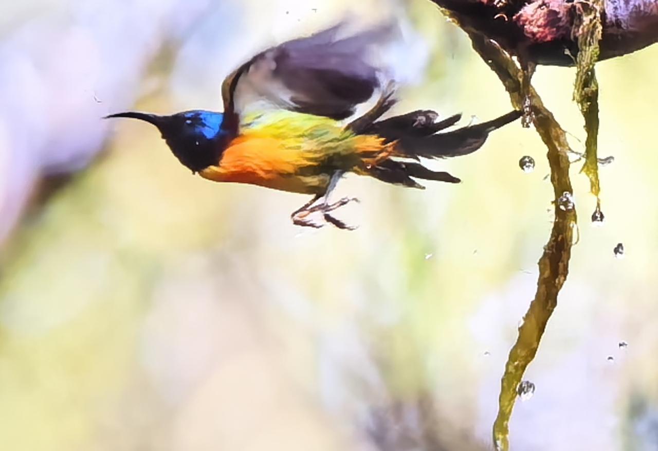今天只加新了一种鸟! 12日早,气温只有2度。 昨夜还是没睡好,水流声依旧,躲在被窝里也觉得寒气逼人。晨起,山下有大雾。 今天去的是5号点。我的最低目标是争取加新一种鸟就好。乘车上山后,下车走路虽不远,但多是上坡,而且越来越陡。5号点海拔是2067米。客满,有十二人。其中有3位广西鸟友昨天来过今天又来。上午9:12,气温虽有6度,但预报说体感只有2度,手冻得冰凉。上午大部分时间,大家都在冷风中苦等,鸟况不如昨天4号监测点活跃。今天我设想的是能有一个加新鸟即可,稀有的明星鸟如棕腹鵙鹛,昨天出现在这里,但愿今日也能赏光,能来自然好,不来也正常。到11点,来的大都是长尾地鸫、紫啸鸫、云南雀鹛、蓝翅希鹛、橙斑翅柳莺等拍过的老鸟。时近中午,我注意到阳光正透过高大的密林一点点向躲在棚子里的我们靠近。吃中午饭时,刚拿起饭盒就来了一波鸟浪,它们你来我往、争先恐后地挤在一起洗澡,搞得众鸟友顾不上吃饭,赶忙按快门,把本来尚有余热的饭菜彻底整冷了。下午气温逐渐升高,鸟况总体也比上午活跃,等到下午4点半,仍然没有大家期望中的明星鸟出现。 我今天最大的收获是加新了褐头雀鹛一种。另外借助较好的光线,把黑脸鹟莺、棕臀凤鹛、绿喉太阳鸟的姿态拍得比昨天要好。 当日在5号监测点,我共计拍摄的鸟种数也超过了20种。加新比昨天减少了3种,这是我比较遗憾的地方。因在山中未带电脑倒片子,还是先从我相机屏幕上翻拍几张福头雀鹛、黑脸鹟莺、棕臀凤鹛、绿喉太阳鸟及山中影像等片子分享一下,希各位亲谅解。