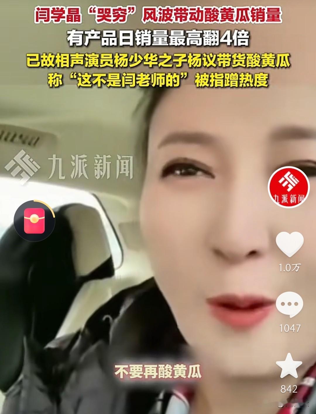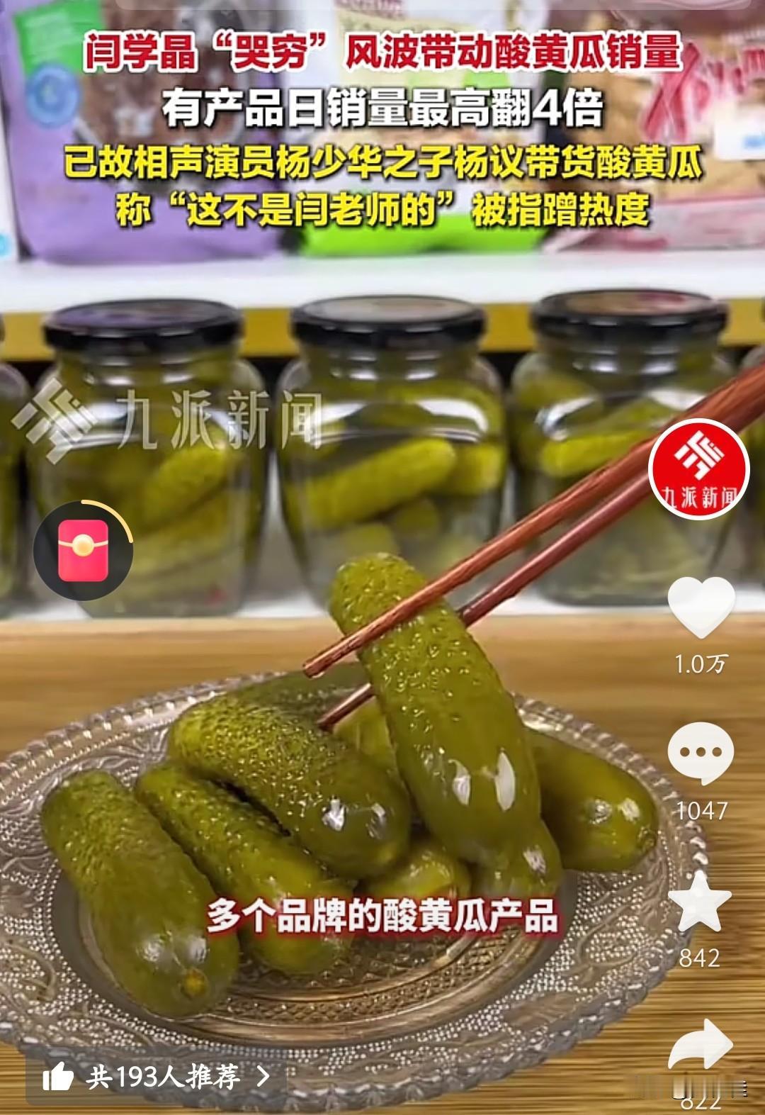 闫学晶哭穷最大的赢家居然是酸黄瓜!谁能想到一场“哭穷”风波,直接让酸黄瓜成了香饽饽,多个品牌的酸黄瓜日销量最高翻了4倍,这波热度蹭得也太意外了。 闫学晶那边还在为“酸黄瓜”言论辩解,喊着“不要再酸黄瓜”,这边酸黄瓜的销量却一路飙升,连相声演员杨议都跑来带货,还特意强调“这不是闫老师的”,结果被网友吐槽是蹭热度。 闫学晶的“哭穷”,反倒给酸黄瓜做了免费广告,估计商家做梦都要笑醒了。