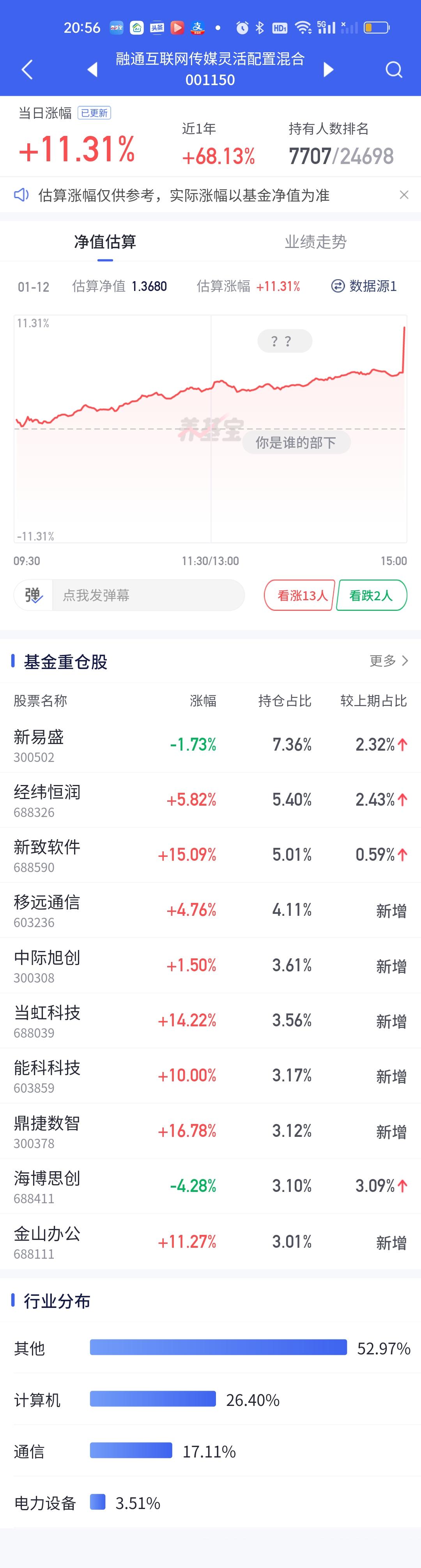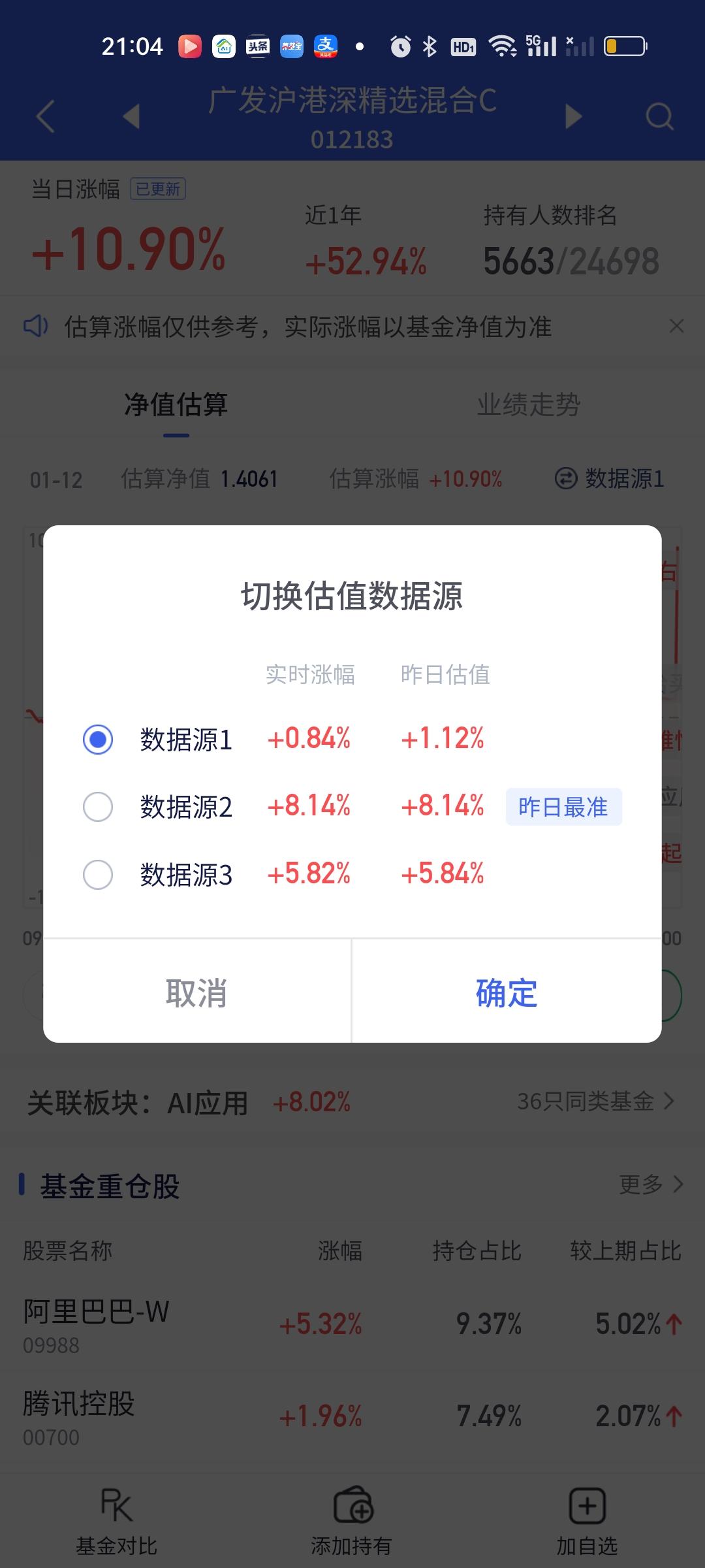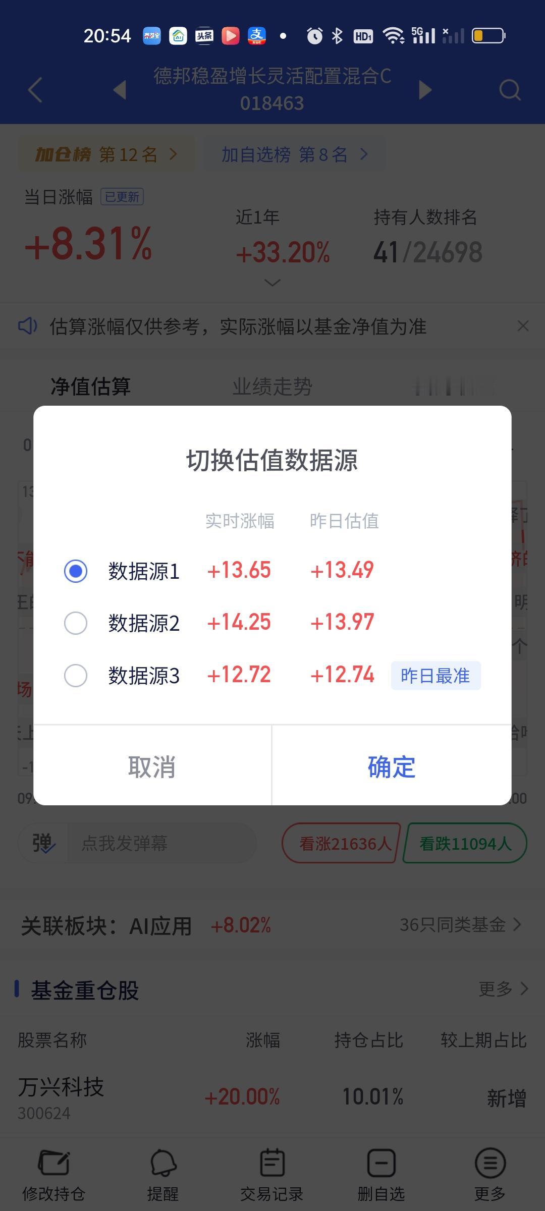 稳盈这个超级低开有点让人摸不透。和西部利得的超级高开形成了鲜明的对比,一个13.65开8.31,一个8.52开14.16,里外差了5个点以上了。看稳盈的持仓今天最少也要开14%才对,因为它前十大重仓股20%的涨停就有4只,10%的涨停2只,剩余4只涨幅也都在14%以上,按照道理无论如何不可能只开8个多点。难道调仓换股了?今天广发沪深港精选最牛0.84开10.90。