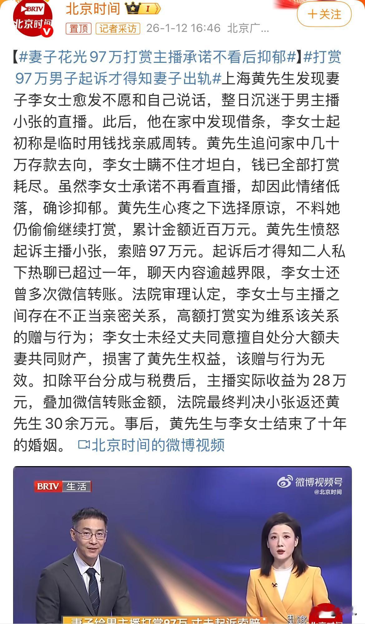 黄先生感觉家里最近冷清得不对劲。 妻子李女士总是一个人捧着手机,一看就是大半天。喊她吃饭,她也只是嗯啊应付过去,眼睛都没离开过屏幕。跟她聊家常,她也提不起劲,问就是在看直播。 家里的钱,好像也不太对劲。黄先生发现抽屉里多了一张借条。他拿着借条问妻子,妻子开始说是亲戚有事,临时周转。但黄先生心里越来越不踏实,他想起了夫妻俩这些年辛苦攒下的几十万存款。他反复追问,钱到底去哪了。李女士终于扛不住压力,哭着说了实话:钱都打赏给一个男主播了,一分不剩。 将近一百万,就这么没了。 看着妻子痛苦的样子,黄先生心软了。李女士也哭着保证,以后再也不看那个直播了。可是,这个保证之后,李女士并没有好起来。她整天情绪低落,后来去医院,确诊了抑郁症。黄先生看着心疼,他觉得,钱是身外之物,人才是最重要的。他选择原谅妻子,想陪她一起熬过去。 但生活又一次戏弄了他。黄先生发现,妻子竟然还在偷偷看那个主播,还在给他打赏。之前的眼泪和承诺,都是假的。 这一次,黄先生没有再忍。他把那个主播告上了法庭,要求归还那97万。直到起诉,看到了证据,他才知道了更残酷的真相。原来妻子和那个主播私下在微信里热聊已经超过一年,聊天的内容早就越界了。妻子还曾多次给主播私下转账。 这已经不是简单的打赏了。 法院审理后认为,李女士和主播之间存在不正当的亲密关系。她打赏出去的巨额钱财,是为了维系这种关系,属于赠与。而这笔钱,是夫妻俩的共同财产,她一个人无权这么处理。这严重损害了丈夫黄先生的权益。 所以,法院判决,这个赠与行为无效,主播必须还钱。 但法院算得很实际。打赏的钱,平台要分走一部分,还得交税。主播小张实际拿到手的,是28万。再加上那些私下微信转账,法院最终判决,小张一共要返还黄先生30多万元。 钱,算是要回来了一部分。 可家,彻底散了。十年的婚姻,走到了头。黄先生和李女士,最终还是离了婚。 这事传出来,周围的人看法挺多的。 有人说,这男主播太不地道,明知道人家有家庭,还这样收钱聊天,跟骗钱有什么区别? 也有人说,这妻子也是糊涂,为了一个虚拟世界里的人,把实实在在的家和丈夫都弄丢了,最后自己还得了抑郁,图个什么呢?现实里的温暖不比手机里几句嘘寒问暖强吗? 还有人说,做丈夫的也挺难的。一开始选择原谅,是重情义;最后选择离婚,也是被伤透了心。外人看着都替他憋屈。 更多的人是叹气,觉得一个好好的家,就这么被一个手机屏幕给毁了。虚拟世界的热闹,填不满现实生活的空洞,反而把日子烧出了一个大窟窿。