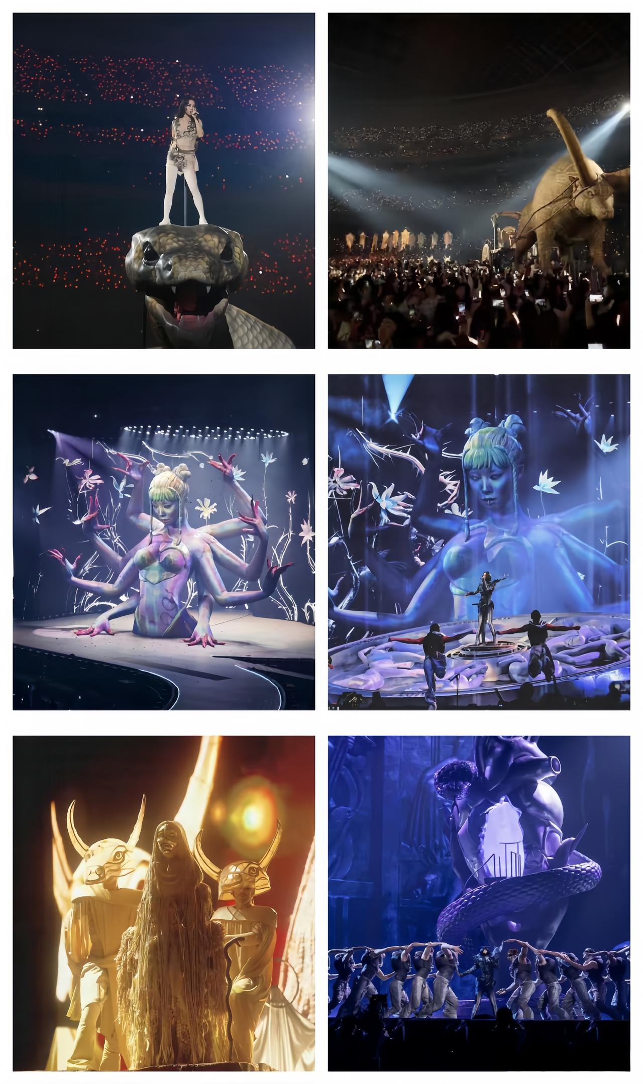 蔡依林的这个演唱会,舞台效果确实有点诡异,又是牛又是蛇的,你是来唱歌的还是来扮演牛鬼蛇神的? 据有些带小朋友的网友说,孩子都给吓着了。这也难怪,我看图片都感觉有点瘆得慌,那场景和东京奥运会的百鬼夜行开幕式差不多,挺膈应人的。 演唱会演唱会,希望艺人能把重点放在演唱上,毕竟大家是来听歌的,不是来看舞台剧的,就算是舞台剧,也请搞的正常点,别那么离谱。