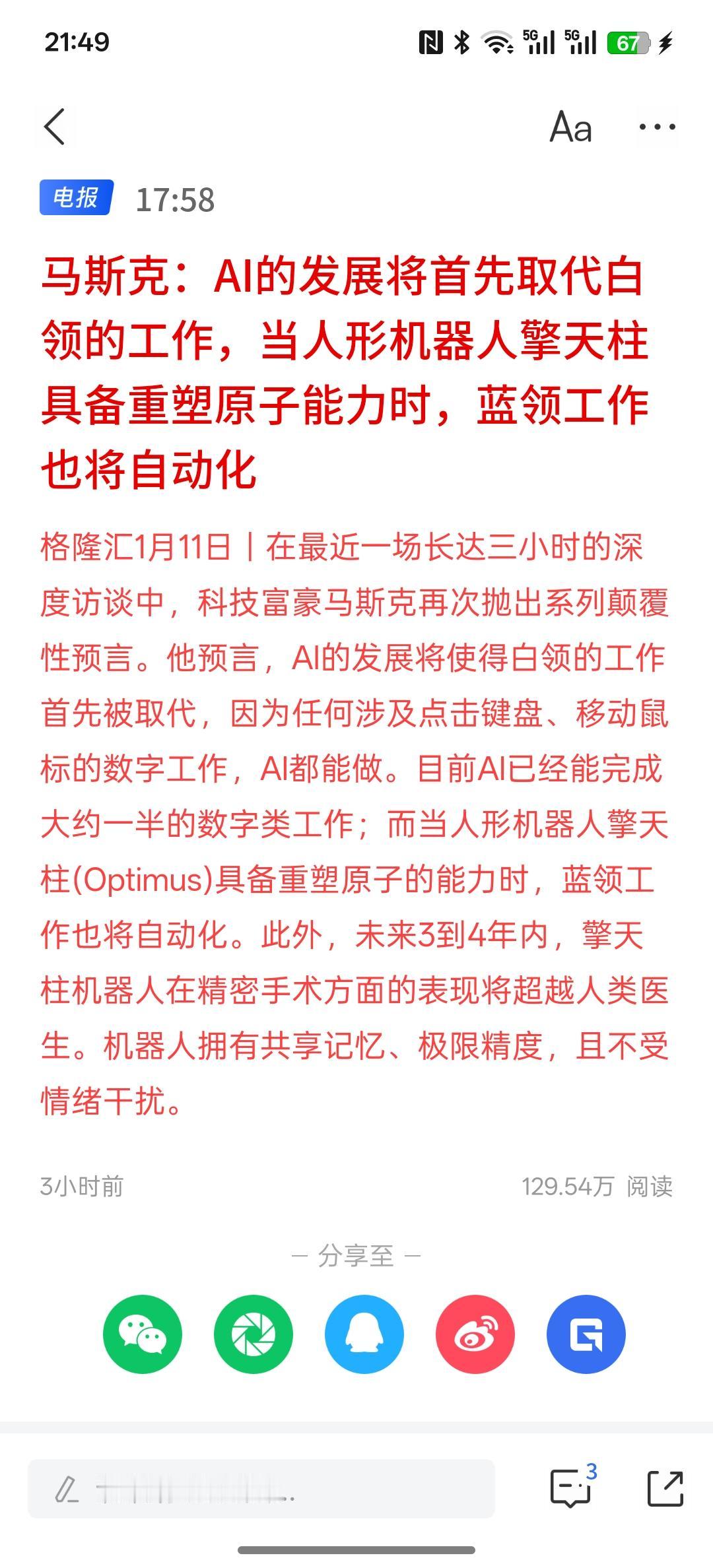 马斯克:AI的发展将首先取代白领的工作,当人形机器人擎天柱具备重塑原子能力时,蓝领工作也将自动化! 该技术的快速发展,确实可以取代很多白领工作!人工智能的快速发展将应用场景的落地,可以推动科技进步,推动产业的升级。未来,人工智能结合人形机器人将更加的有助于人类的双手解放! 人形机器人在各行各业都可以应用!呃,未来人工智能的发展需要更多的算力,而算力以及电力的需求,这是非常巨大的!我门在这方面领先于美国至少三倍以上的电力发展