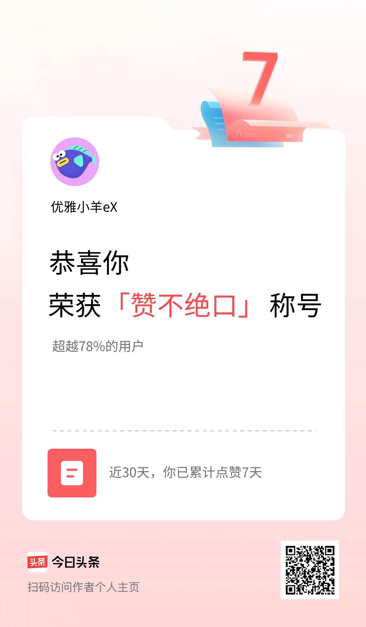 我在头条30天内点赞打卡7天,获得“赞不绝口”称号