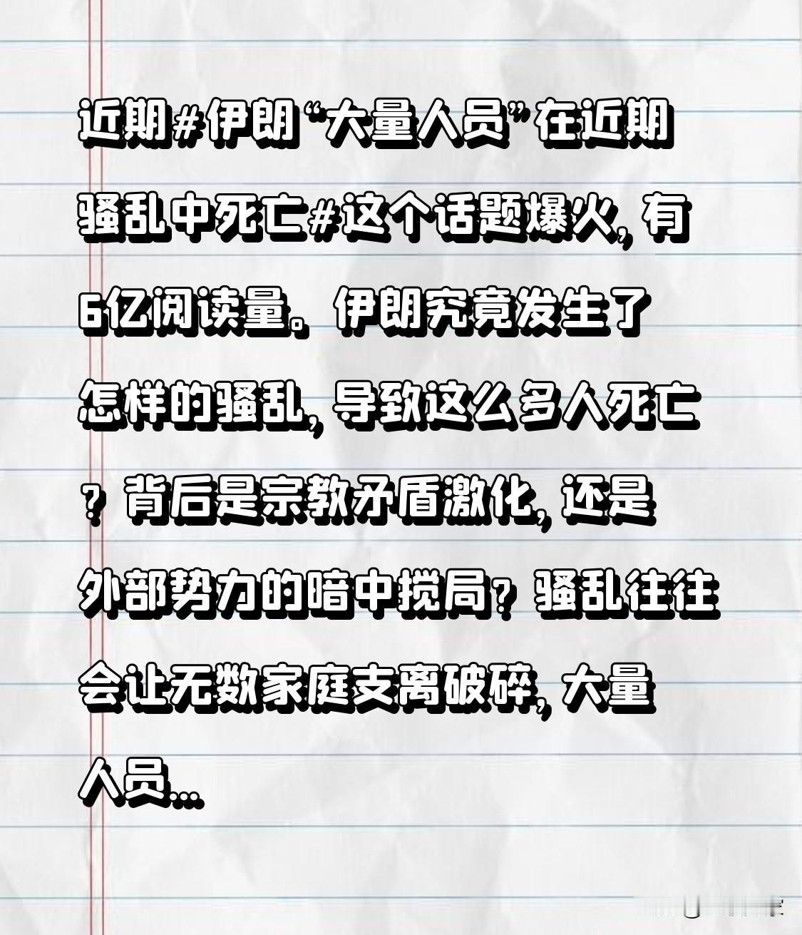 近期伊朗“大量人员”在近期骚乱中死亡这个话题爆火,有6亿阅读量。伊朗究竟发生了怎样的骚乱,导致这么多人死亡?背后是宗教矛盾激化,还是外部势力的暗中搅局? 骚乱往往会让无数家庭支离破碎,大量人员死亡的背后是无数个悲剧故事。伊朗一直以来在中东地区有着重要的战略地位,此次骚乱的影响或许会波及地区局势。 大家觉得这次伊朗骚乱的根源是什么?后续又会如何发展?它会对中东地区的地缘政治产生怎样的影响? 伊朗大变化 伊朗困境 伊朗军事大事件 伊朗叛乱 伊朗巨变 伊朗反抗 伊朗反击潮 伊朗游行 伊朗巨变 伊朗反抗 伊朗游行 伊朗大规性骚乱 伊朗示威 伊朗伊以冲突 伊朗大撤离