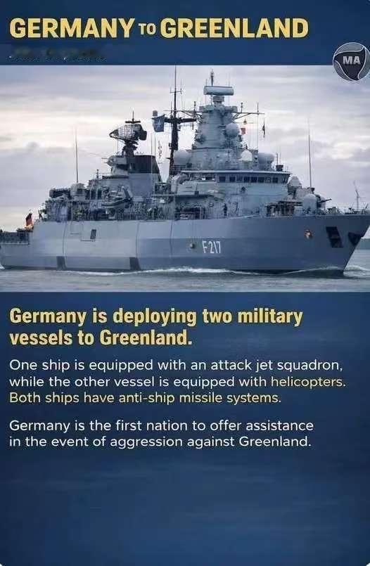 默茨来真的?派了两艘军舰去格陵兰,真实意图是什么? 据相关报道,德国正在向格陵兰岛部署两艘军舰;一艘船装备了一个攻击机中队,而另一艘船装备了直升机;两艘舰艇都有反舰导弹系统。 德国是第一个在格陵兰遭到侵略时提供援助的国家,法国马克龙、英国首相斯塔默,欧盟主席冯德莱恩都发声谴责了,但是,没有付出行动,而默茨,是真正的做出行动的。 恐怕连特朗普都没想到,默茨会派舰船去格陵兰,这一次,有好戏看了。 如果美国真要武力夺取格陵兰岛,默茨敢对美国开火吗? 我认为,这只是默茨去威慑而已,想在欧洲做领头羊,所以,他派出军舰去支持丹麦,丹麦会感激德国,拉拢人心,届时复辟军国主义,德国就有了伙伴了。 同时,欧洲国家看到了德国如此坚定的支持,有可能出现欧洲国家都派兵去保护丹麦,毕竟都是盟友,该出手。 不知道特朗普会不会被吓到,因为欧洲国家敢出手,至少现在派了军舰去了。 真希望他们能打起来。