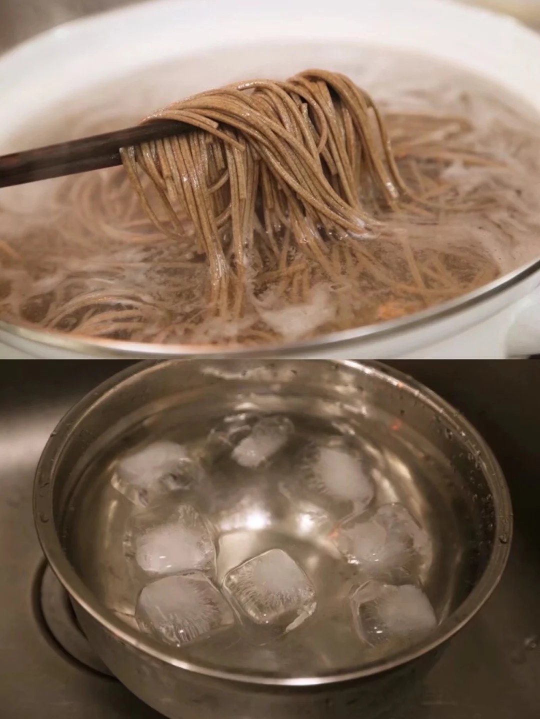 2.煮面的时候一个稍微大一点的容器里面准备好冰水 等会儿煮好的面条先凉白开降温 在放进准备好冰水里 激一下吃起来口感会更好哦