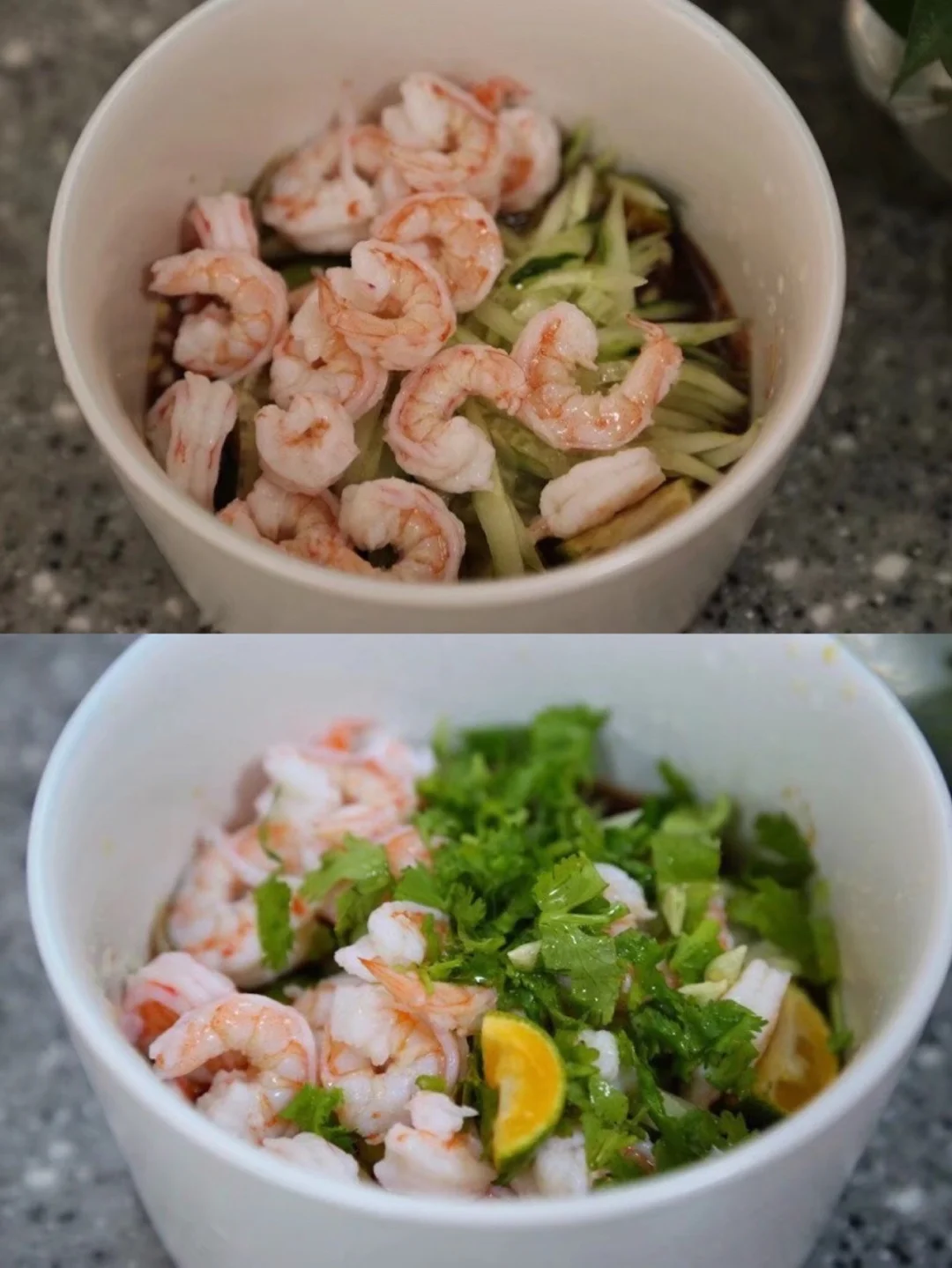 6.黄瓜洗净去瓤然后切细丝儿 可以多切一些 减肥嘛这个放进去口感还挺好的