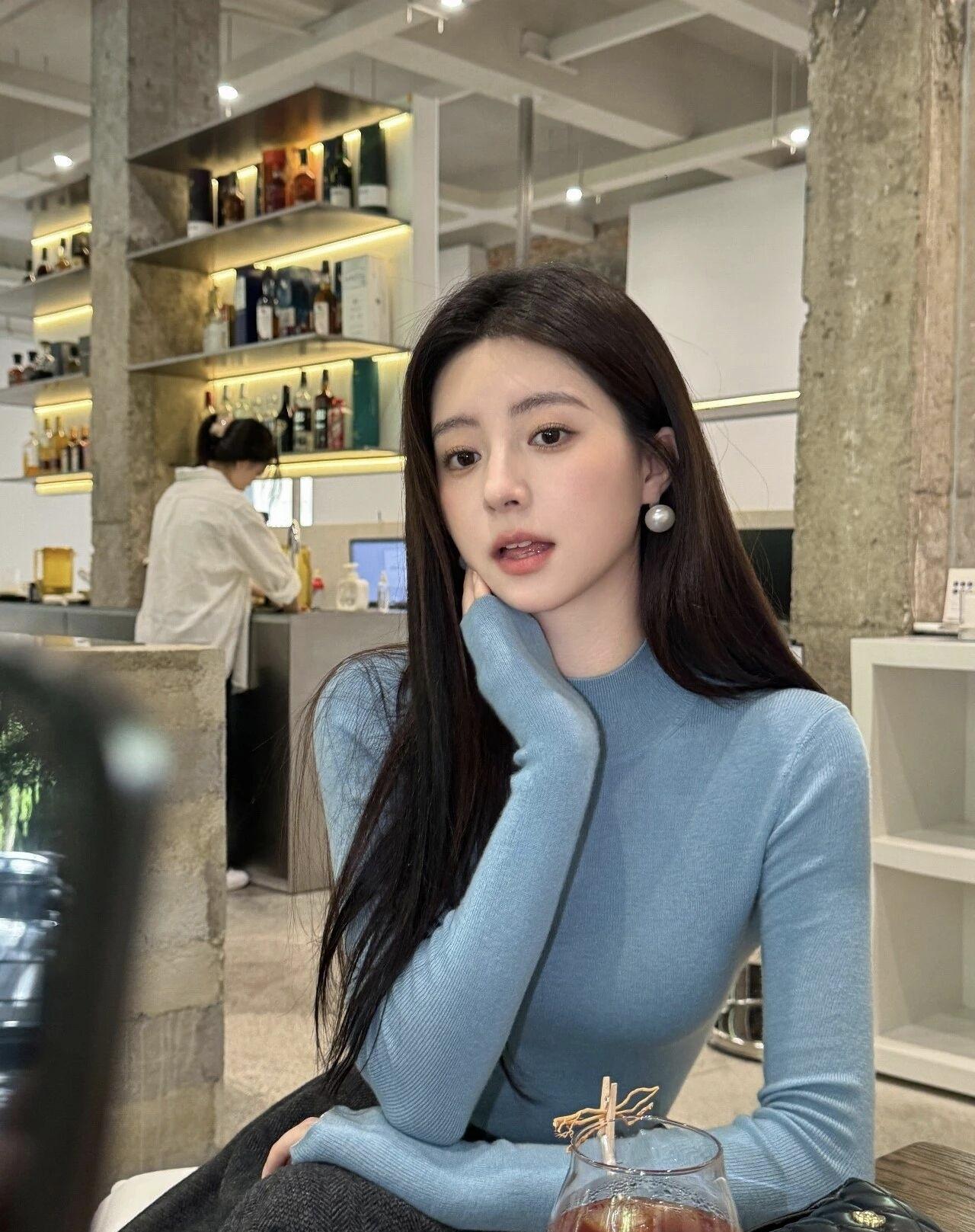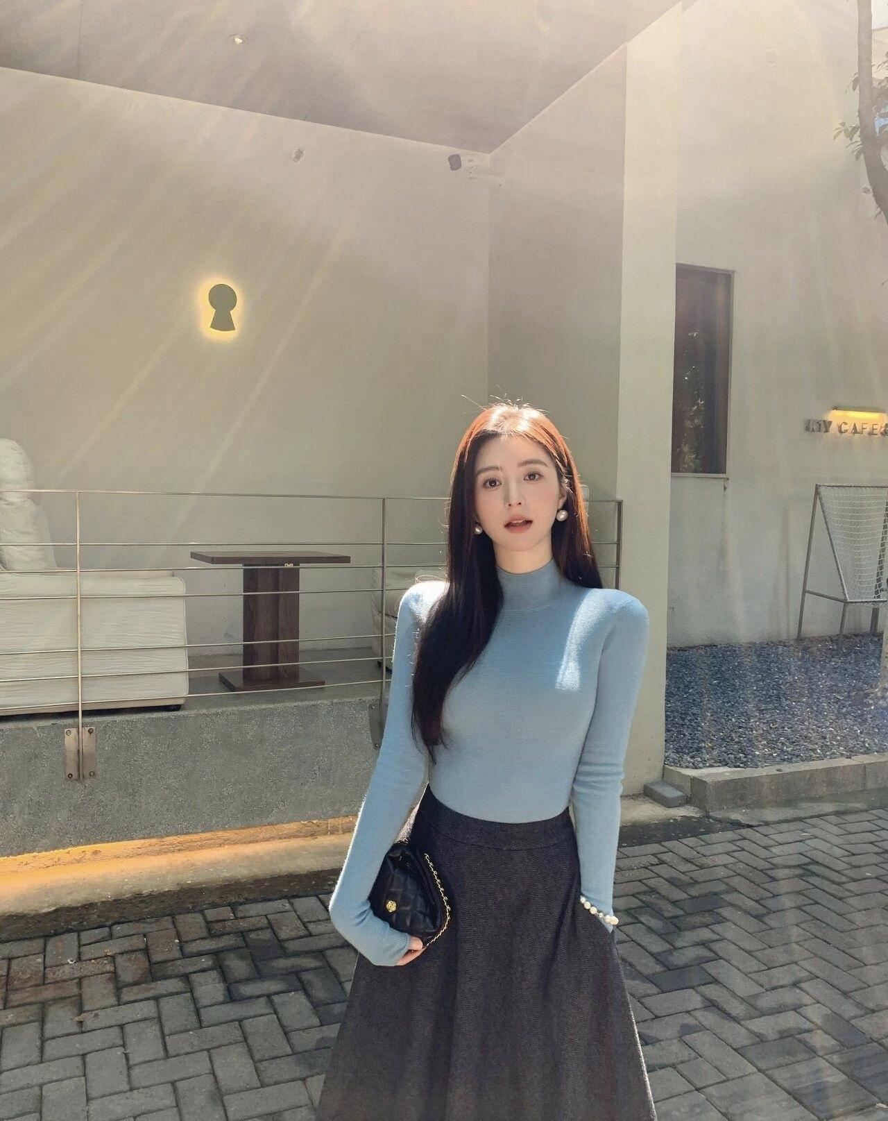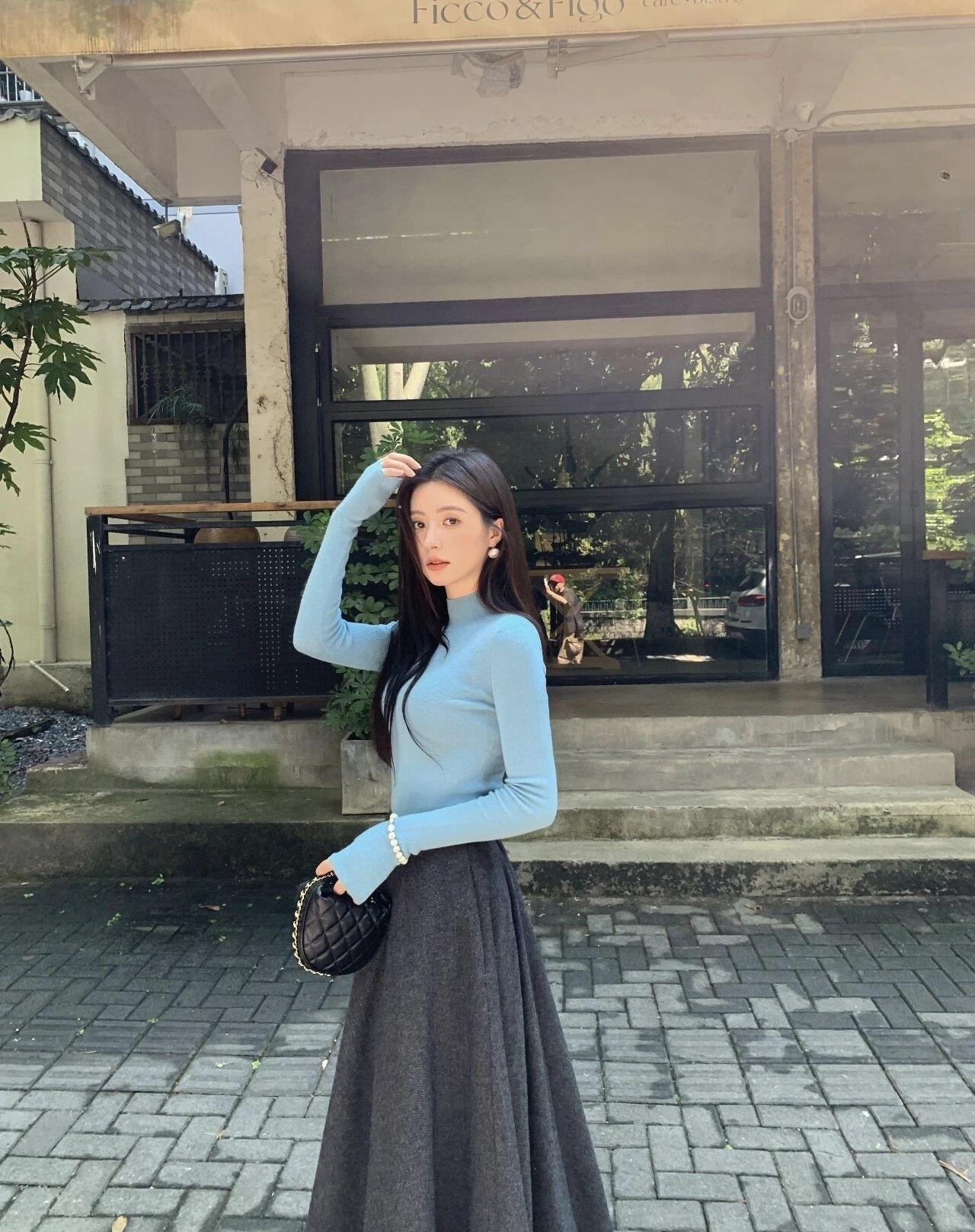 浅蓝针织衫搭配深灰半身裙,在街角与暖阳撞个满怀,慵懒又惬意