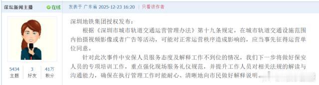 【深圳地铁站台内能拍照吗】市民在地铁站台内拍照被喝止日前,记者注意到有市民反映,其于12月21日前往光明农场大观园游玩,因是首次乘坐地铁6号线支线,觉得“碧眼”这个站名很好听,便在地铁站站台内对站名进行拍摄。 该市民称,拍照前曾查看屏幕提示,确认列车将于两分钟后进站。由于时间较晚、站内乘客稀少,其认为不存在影响列车正常运营及侵犯他人肖像权的情况。为遵守安全规定,该市民还特意望了一眼身后,确认站在黄线区域外才拿起手机。 随后,地铁安保人员发现其拍照,一边走近一边高声制止:“你拍什么 拍什么?站台不让拍照”市民原以为工作人员会要求删除照片,便向其展示手机,对方见状未再多言,随即从身旁走过。对此,该市民提出疑问:深圳地铁站台内是否有禁止拍照的规定?为何站内未看到相关禁止标识? 针对市民反映的情况,深圳地铁集团日前作出回应表示,根据《深圳市城市轨道交通运营管理办法》第十九条规定,在城市轨道交通设施范围内拍摄视频影像或者广告等活动,可能对正常运营秩序造成影响的,应当事先征得运营单位同意。 针对此次事件中安保人员服务态度及解释工作不到位的情况,深圳地铁集团下一步将做好保安人员的专项培训工作,重点强化现场服务礼仪规范,并提升工作人员对相关法规的解读与沟通能力,确保在执行管理工作时能耐心、清晰地向市民做好解释说明。