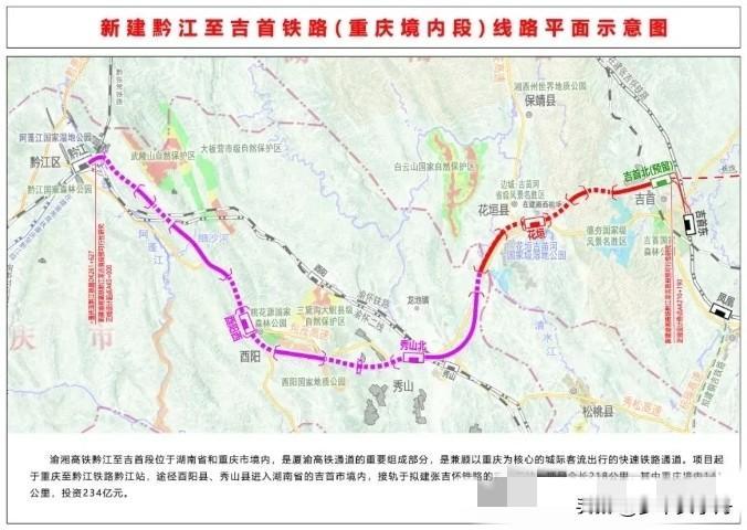 好消息!近期,国内高铁建设领域再度迎来重点消息——黔江至吉首铁路项目前期工作进入国家审查关键阶段,标志着这条串联重庆与湖南省市的高铁线路有望加速实施。作为年内第二条完成国家专项审查的新建高铁项目,该线路的推进正为区域交通格局注入新的动力。 根据规划,黔吉高铁新建线路全长约222公里,分为湖南段(72公里)与重庆段(150公里)两部分,全线按最高时速350公里设计,估算工程总投资约464亿元,其中湖南段投资约155亿元。线路以渝厦高铁黔江站为起点,途经重庆市黔江区、酉阳县、秀山县,进入湖南省湘西州花垣县、保靖县、吉首市等重要节点,最终引入已有张吉怀铁路的吉首东站完成接驳。 据悉,全线共设置5座车站,包含新建酉阳西站、秀山北站和花垣站3座新站,并充分利用现有黔江站及吉首东站进行衔接,力求在优化线路布局的同时实现资源集约。项目计划建设周期为5年,如能顺利推进,预计将在未来几年内实现工程贯通并逐步投入运营。 黔吉高铁的规划与建设,其意义不仅在于两地交通的物理连接,更在于对区域经济结构与空间格局的深远影响。从重庆视角看,该线路建成后将有效补齐“米字型”高铁网在东南方向的延伸环节,加快形成覆盖更广、效率更高的铁路运输体系。尤其对于渝东南地区而言,项目将帮助酉阳、秀山等区域实现“县县通高铁”目标,推动当地交通发展迈上新台阶。 与此同时,黔江至吉首铁路也将显著缩短区域间的时空距离。当前,重庆主城至渝东南片区依赖普速铁路,单程耗时约5小时;高铁通车后,预计旅行时间将大幅压缩至1.5小时左右,真正实现从“普铁时代”到“高铁时代”的跨越。 综合来看,黔江至吉首高铁项目的快速推进,意味着项目前期工作取得积极进展,随着项目持续向前,一条贯穿渝湘、串联山区的交通纽带即将成为实现,值得期待!